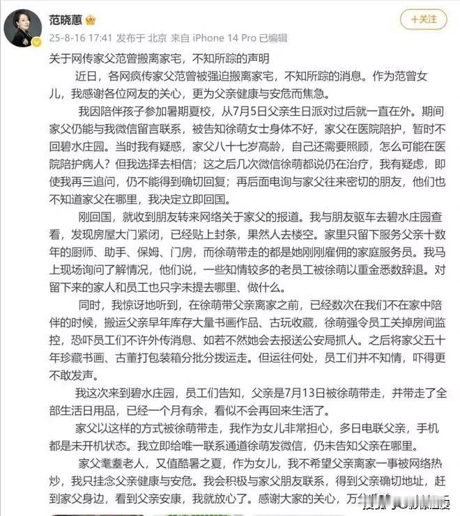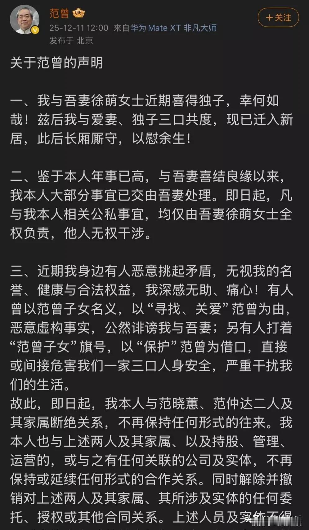 87岁范曾近况引热议!官宣与小48岁的妻子徐萌喜得一子,还把所有资产都交予对方打理。同时,他宣布与女儿等亲属断绝关系,起因或与此前女儿称其被“挟持”有关。网友议论纷纷,你怎么看?