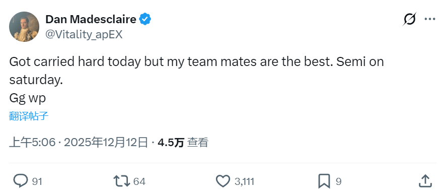 赛后,apEX似乎并未受此影响,反而在社交媒体上幽默调侃了自己的表现。他于赛后发布推文写道:“今天纯被队友带飞,但我的队友是最棒的。周六半决赛见。GGWP(打得好,打得漂亮)。”