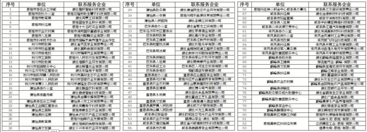 根据《恩施州“解难题、稳增长、促发展”服务企业工作方案》,恩施州8县市和恩施高新区均出台了联系服务企业工作方案,建立了“4个1”(1名县领导+1个责任部门+1家金融机构+1名服务秘书)联系服务企业工作机制,299名县(市)领导、459个县(市)直单位共联系服务1299家企业。