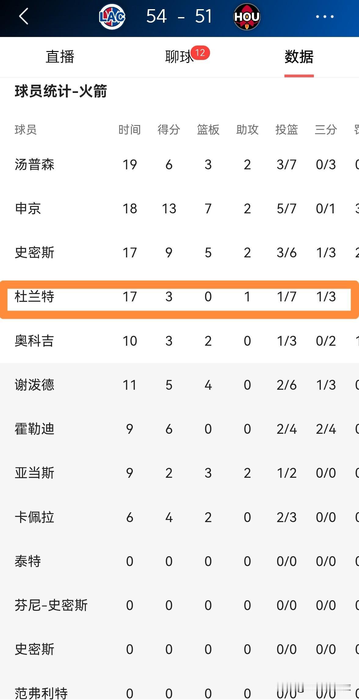 火箭超级巨星杜兰特真是毫无存在感!在今天火箭主场迎战快船的焦点战中,目前双方的上半场比赛已经结束,火箭以51:54落后于对手。让人感到非常失望的是,在前两节比赛中,杜兰特首发出战17分钟,投篮7中1,其中三分球3中1仅仅得到可怜的3分,还出现了2次失误,他的场上正负值为-7。 坦白说,在这场星光熠熠的较量中,杜兰特俨然成为了最没有存在感的球员。