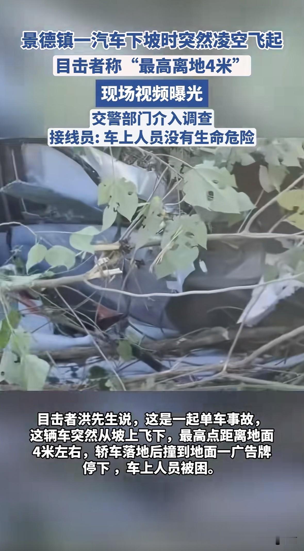 10月7日,景德镇高铁北站附近路口,一辆轿车从坡上凌空飞起,最高点离地面约4米,落地后撞广告牌停下,车上人员被困。目击者说车差点撞到自己,司机腿部受伤,猜测是阳光晃眼误踩油门。 8日交警回应,人员无生命危险,事故原因还在查。 这事儿看着惊险,其实藏着常见隐患。阳光刺眼易致视线不清,不少事故都和这有关。更关键的是驾驶习惯,很多人不踩油门时脚没放刹车上,紧急情况就容易踩错。 开车真得留心,遇强光及时用遮阳板或偏光镜,平时养成“闲时脚放刹车”的习惯。安全这事儿,从来都是细节说了算。你们开车遇过类似惊险时刻吗?