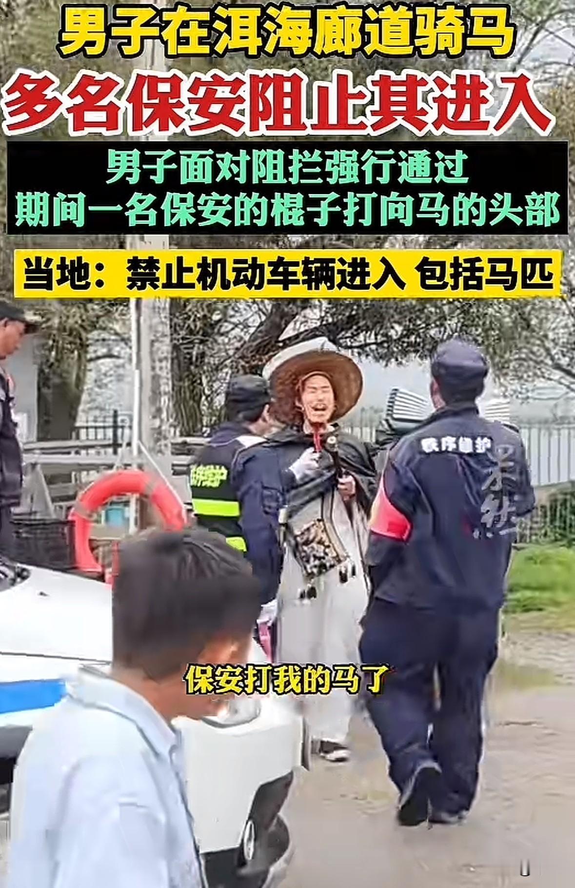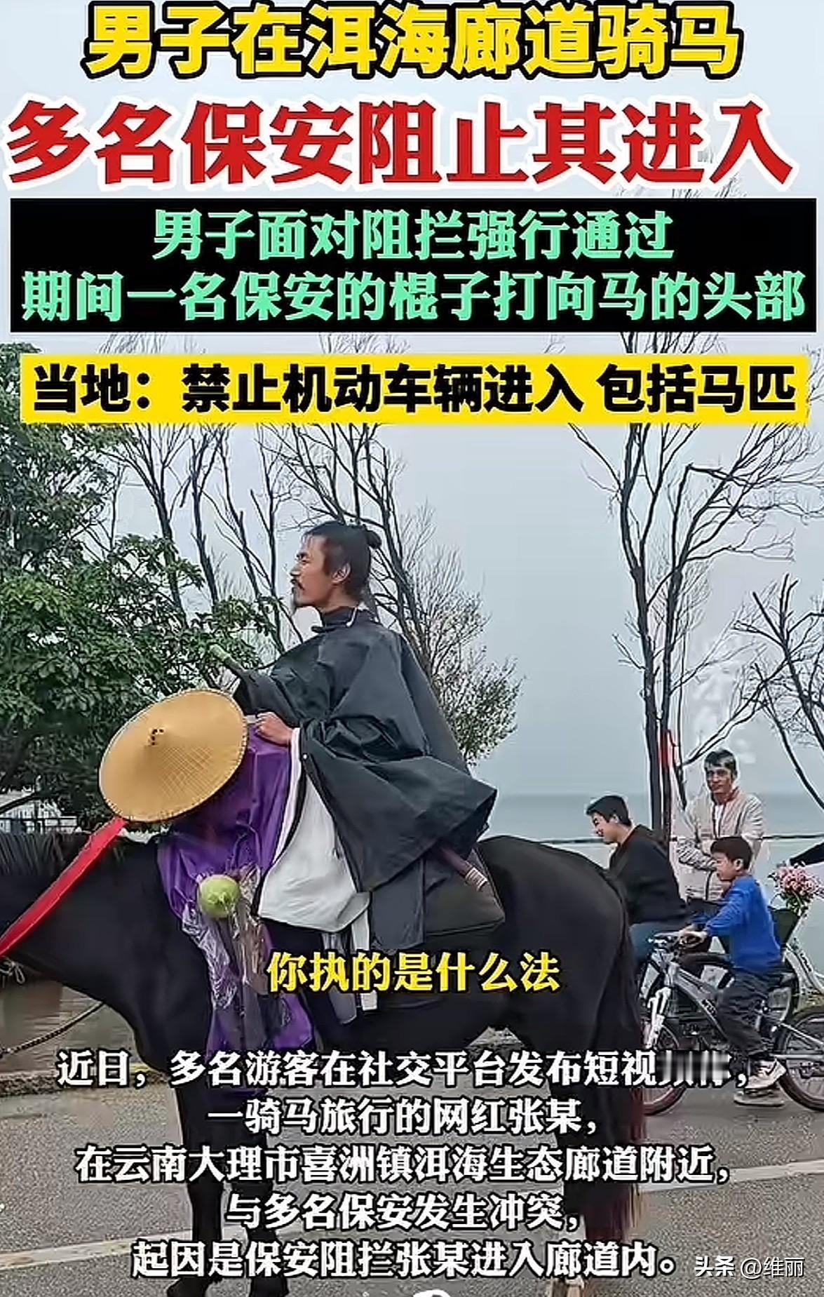 近日,骑马旅行的网红张某在大理喜洲镇洱海生态廊道,因试图骑马进入被保安阻拦,双方发生冲突。 视频里,保安多次劝阻张某遵守规定,张某称只是路过要离开,仍骑马向前冲。保安带盾牌阻拦无果,有人用棍子打到马头,张某喊话称保安打马。 10月8日,喜洲镇政府回应,廊道禁止机动车及马匹入内,此前还有过交通秩序专项整治。 相关视频超1.2万点赞,3600多条评论。网友大多支持保安,觉得景区人多,马受惊太危险,必须守规则。 现在张某的社交账号已经注销。个性化旅行得有边界,公共安全和景区规定不能无视,网红更该有社会责任感。
