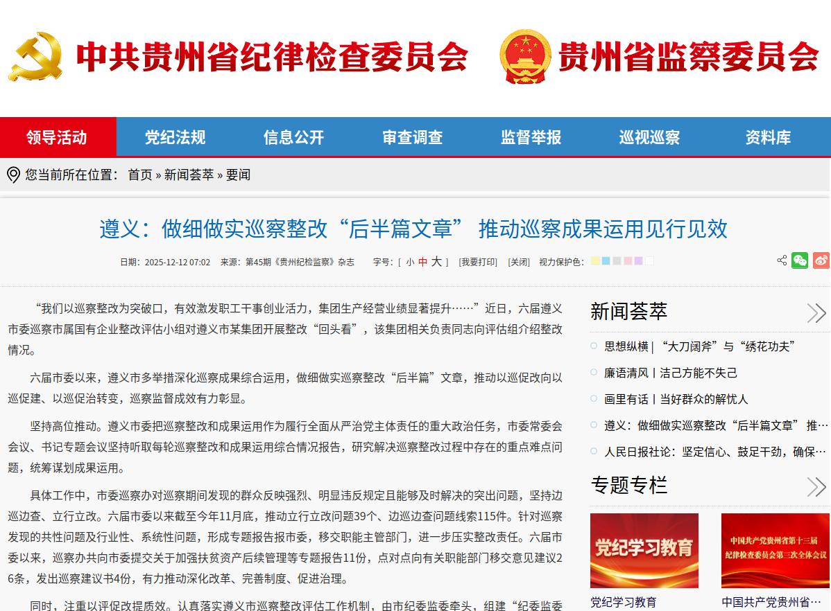 六届市委以来,遵义市多举措深化巡察成果综合运用,做细做实巡察整改“后半篇”文章,推动以巡促改向以巡促建、以巡促治转变,巡察监督成效有力彰显。