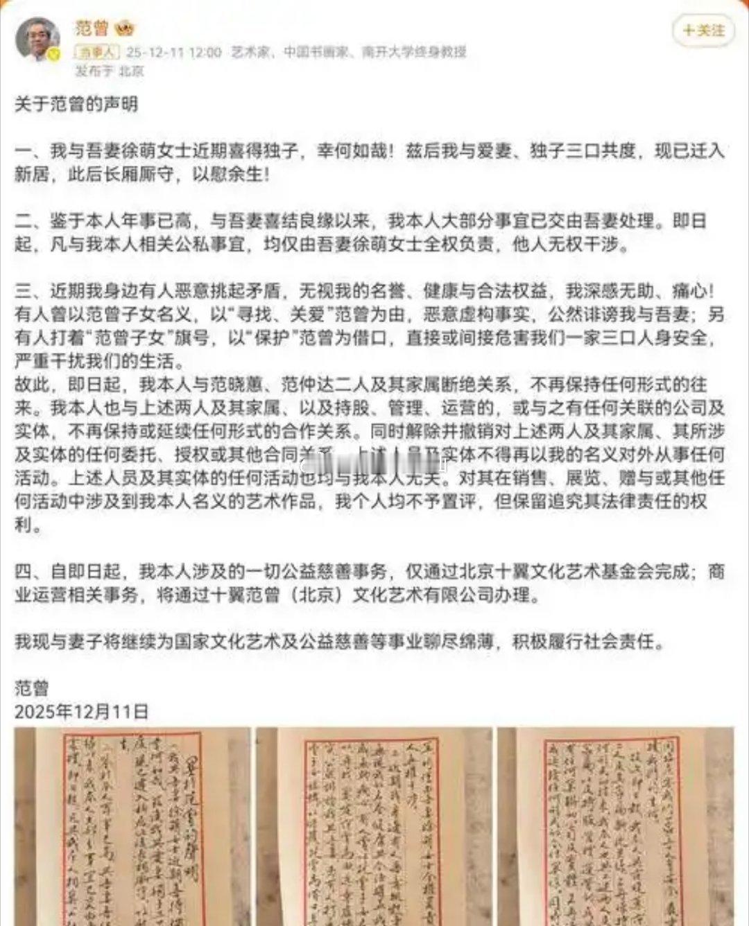 你说这事邪乎不邪乎?一个87岁的老爷子范曾,一边乐呵呵宣布自己“喜得独子”,一边就跟女儿、继子彻底断绝了关系。以前这种戏码,我只在电视剧里见过,没想到现实中还真上演了。老一辈人看重亲生儿子、偏心眼,这咱多少能理解。不想要继子也就算了,可连亲生女儿都这么干脆地断绝关系,这也太狠了点吧?真是应了那句老话——“有了后娘就有了后爹”,具像化了。