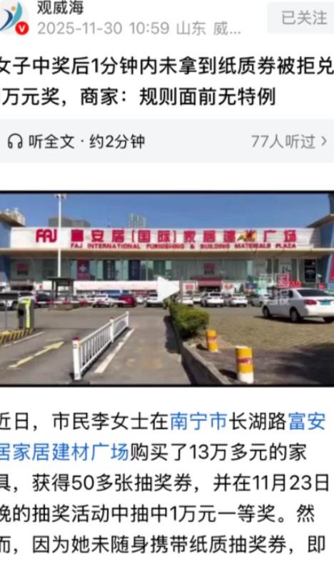 11月30日,广西南宁,女子在建材市场买了13万的家具,商家送她50多张抽奖券,没想到,女子在抽奖环节抽中一等奖1万块,就在她兴冲冲准备领奖时,主持人忽然话锋一转,说中奖者必须在1分钟内持纸质抽奖券正券上台应号,女子心里一咯噔,没人告诉她必须拿抽奖券兑奖,所以她出门压根没带,不过她拍照留存了,于是,女子出示了奖券照片、身份证和销售单,然而她还是遭到拒绝,和1万大奖失之交臂。 女士为了布置新家,在南宁当地一家建材市场完成了一笔大额消费,一次性选购了价值 13 万元的家具,从沙发、衣柜到餐桌椅一应俱全。 付款后,商家告知她,消费满额可以领取抽奖券,她的消费金额能拿到 50 多张,这些抽奖券号码都是连号的,商家工作人员当时只说了周末有抽奖活动,一等奖是 1 万元现金,却没提任何兑奖的特殊要求。 女士想着多一张券多一次机会,便把所有抽奖券收在家里,还特意用手机拍了照片留存,她平时做事就习惯留个凭证,没想到这个习惯后来没能帮上忙。 抽奖活动当天,女士特意抽空赶到了建材市场的活动现场。现场参与抽奖的人不少,大家手里都拿着纸质抽奖券,等着主持人喊号。 随着抽奖环节推进,三等奖、二等奖陆续开出,女士都没中,就在她以为这次只是凑个热闹时,主持人念出的一等奖号码让她瞬间来了精神 —— 这个号码和她手机里存的其中一张抽奖券号码完全一致。 女士立刻站起身,朝着舞台方向示意自己中了奖。可就在她兴冲冲准备上前领奖时,主持人忽然话锋一转,强调起了兑奖规则:中奖者必须在 1 分钟内,持纸质抽奖券正券上台应号,少一样都不能兑奖。 这突如其来的要求让女士当场愣住,她出门时压根没带那些抽奖券,没人跟她提过兑奖必须出示纸质券,她以为有照片就能证明。 情急之下,女士赶紧拿出手机,找出之前拍的抽奖券照片,又翻出购买家具的原始销售单和自己的身份证,一股脑递给现场工作人员。她跟工作人员解释,家里离市场不远,家人可以在 15 分钟内把纸质抽奖券送过来,希望能通融一下。 但工作人员只扫了一眼她的手机,就明确表示不能通融,说抽奖券上的细则早就写了,必须本人持有效身份证件、原始销售单和抽奖券正券现场应号。 女士仔细看了看工作人员出示的抽奖券样本,发现上面确实有相关细则,但她手里的 50 多张券都是商家直接给到的,当时没人提醒她看细则,活动开始前主持人也没提前说明,直到开奖后才强调 1 分钟内持纸质券上台的要求。 她反复跟工作人员沟通,说自己消费凭证齐全,照片也能和商家留存的存根核对,完全能证明中奖资格,但对方始终坚持 “规则面前无特例”,表示活动有公证机构全程监督,不能为她破例,否则对其他参与者不公平。 最终,女士没能领到这 1 万元大奖,主办方当场重新抽取了一等奖。事后,建材市场相关人员向女士表达了歉意,愿意赠送一份礼品或者消费优惠券作为补偿,但始终拒绝兑现 1 万元奖金,女士对这样的处理结果难以接受,双方多次沟通也没能达成一致。 这件事传到网上后,网友们议论纷纷。 有网友说:“商家太不地道了,50 多张券不说清楚兑奖规则,等中了奖才提纸质券,明显就是不想兑现。” 也有网友认为:“规则写在抽奖券上了,自己不看怪谁,要是人人都用照片兑奖,岂不是容易出现冒领。” 还有网友留言:“1 分钟时间也太短了,就算带了券说不定都来不及上台,商家应该多给点缓冲时间。” 其实这件事给大家提了个醒,参加各类抽奖活动时,一定要提前看清活动规则,尤其是兑奖条件、有效凭证和时间限制这些关键信息,不要只听商家口头介绍。 如果遇到规则模糊或者临时变更规则的情况,要及时留存相关证据,必要时可以向相关部门咨询维权。 你觉得这位女士没带纸质券就该被拒兑吗?商家的规则是否过于苛刻?欢迎在评论区留下你的看法。