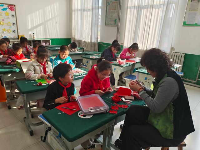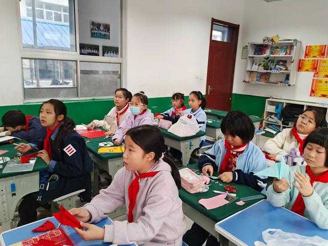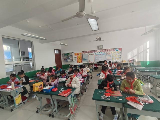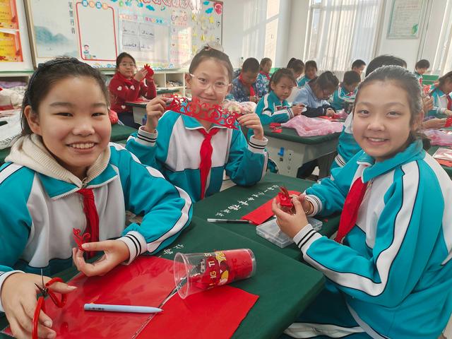 课桌上,有的同学正仔细折叠纸张,有的专注裁剪纹样,还有的举着刚完成的作品和同伴分享——红色的窗花雏形、浅蓝色的纸艺装饰,在孩子们手中渐渐“活”了起来。系着红领巾的同学们时而蹙眉琢磨,时而露出笑意,教室飘满了创作的乐趣。