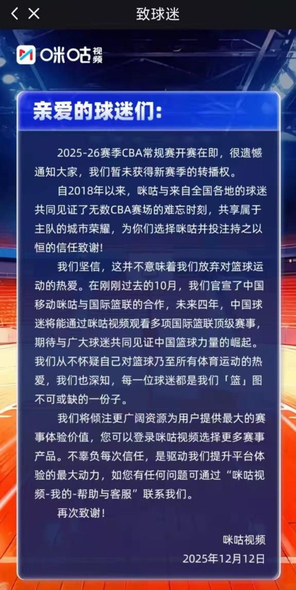 媒体人付政浩爆料分析咪咕和CBA公司,关于播放权的周旋之战! 12月12日是CBA揭幕战开赛日,播放版权给到了抖音平台和央视,晚上都要比赛了咪咕还在CBA公司拉扯播放权。 今天上午咪咕公司写了致球迷信,但据付政浩爆料信是昨晚就拟定好的,在发出之时还在和CBA进行谈判,争取压哨签约。 据球迷分析咪咕是想压价签约,但CBA直接不给独家播放权了也不想低价卖版权,球迷信发出来会起到施压的作用。 恕我直言,咪咕和CBA相辅相成的合作伙伴,咪咕靠转播CBA发家做出来名堂,CBA在疫情时期也获得了咪咕的赞助支撑,两方各退一步今晚就能播放比赛了。