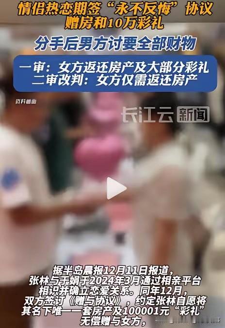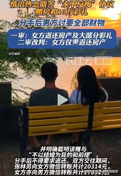 恋爱脑的代价!大连男子赠房转10万签“永不反悔”协议,分手反转太刺激! 热恋9个月豪掷唯一房产+100001元,白纸黑字约定“不以结婚为目的,分手不返还”。 谁知现实问题闹翻后,男方翻脸要回12万余元,一审判女方返还房产+8万元。 二审反转让男方懵圈:10万元不用还(协议合法有效,反悔违背诚信),房子必须还(大额唯一房产隐含婚后用途)! 网友锐评:协议不是万能的,恋爱送大礼真得留点心!恋爱分手协议 恋爱财产协议