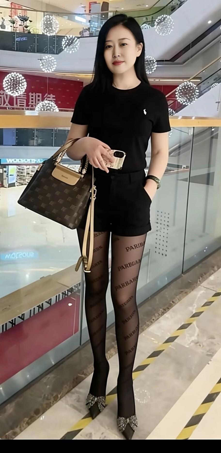 黑色短袖搭配透明印花丝袜,手提包点缀,都市女性风范!