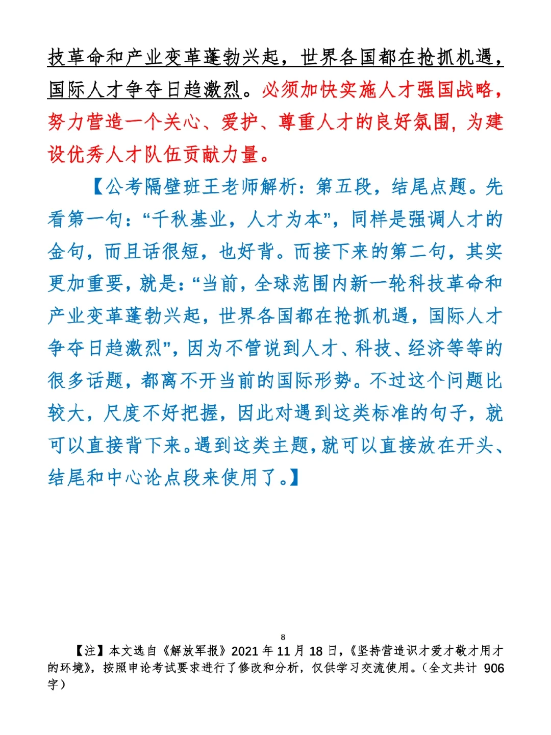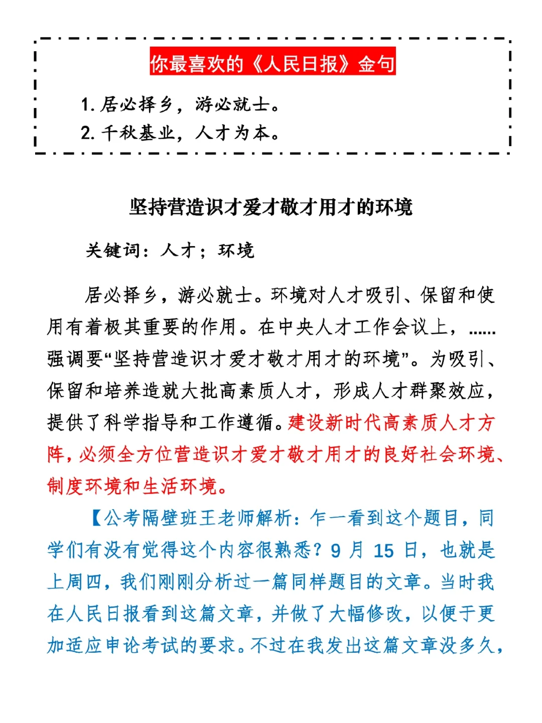如何抄写:每天的抄写文章以图片形式发在“公考隔壁班王老师”账号,红色字是重点句和结构句,黑色字是正文,蓝色字是解析,大家抄写时不必抄蓝色字。建议先通读全文(包括蓝色解析部分),做到心中有数再开始抄写,效果会更好。
