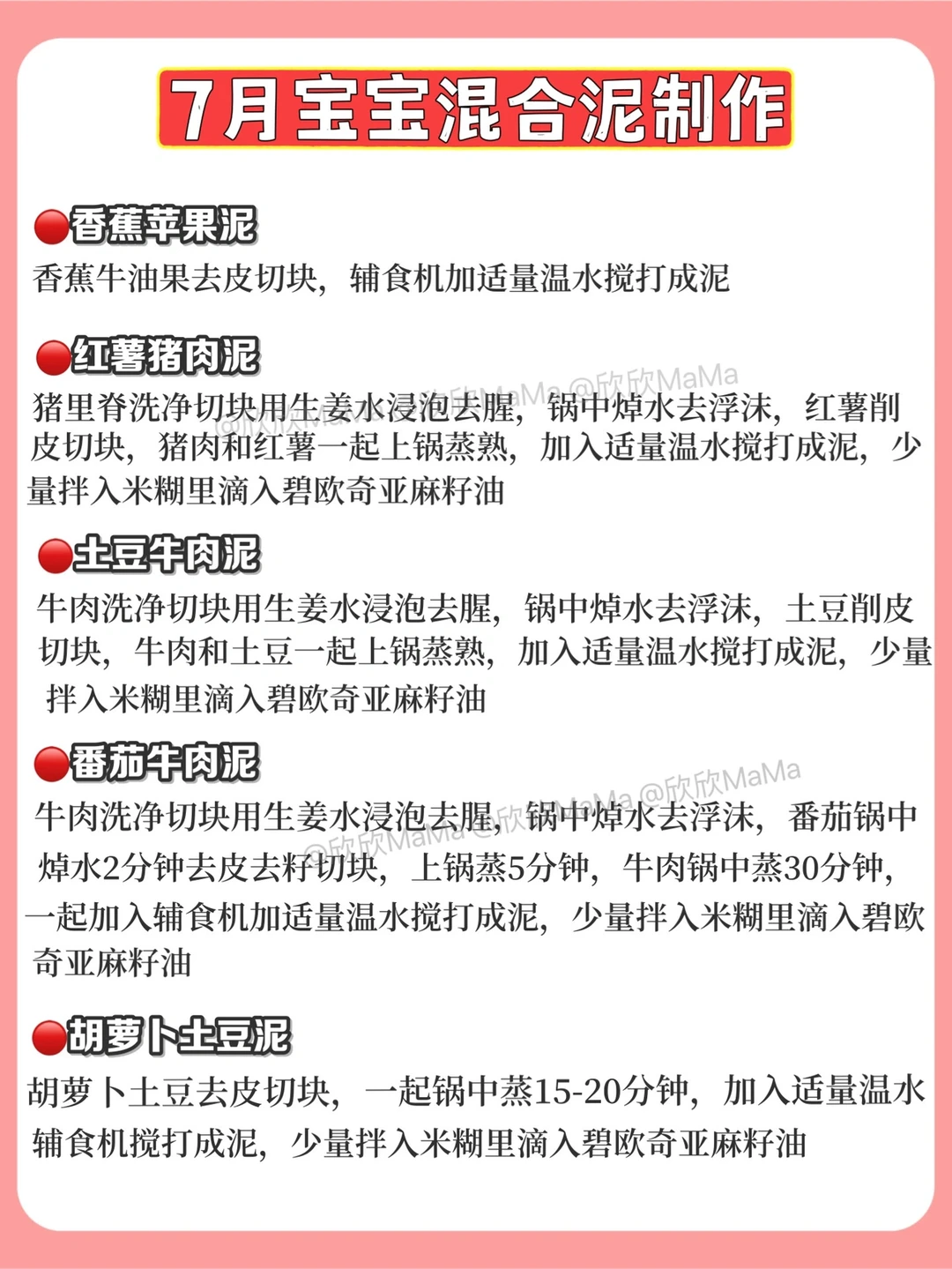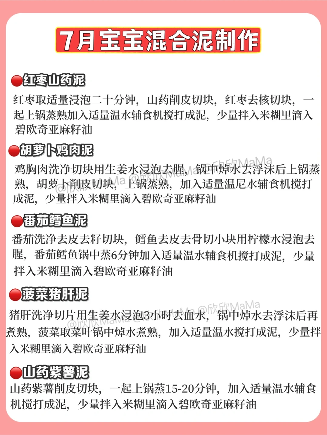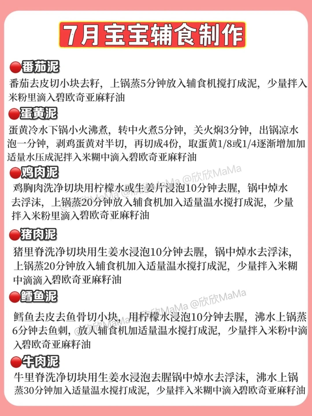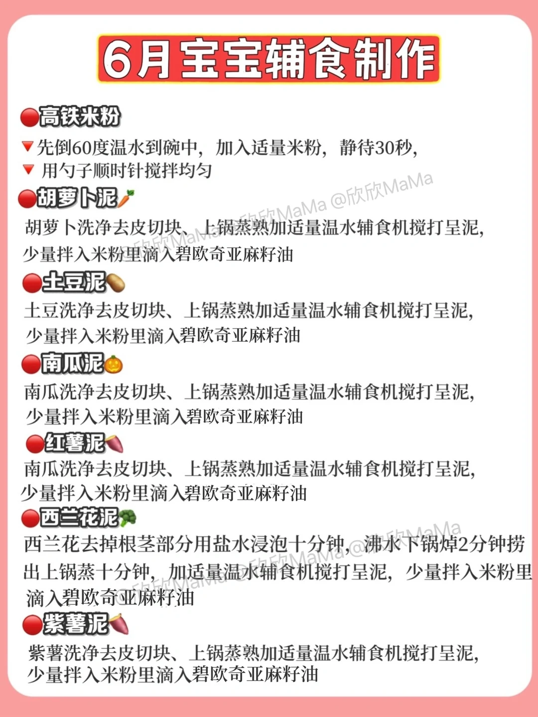 6月龄的宝宝就可以添加辅食了!但作为新手妈妈,辅食该怎么添加?6月龄应该吃什么?7月龄应该怎么吃?今天跟大家分享下近100款辅食泥以及做法,希望整理的对你们有用~ . 🔻米粉冲泡方法 宝宝第一口辅食应该选择高铁米粉 米粉冲泡步骤: 先倒60度温水到碗中,加入适量米粉, 静待30秒,用勺子顺时针搅拌均匀 . 🔻添加辅食顺序 宝宝添加高铁米粉一周后,就可以在辅食里添加蔬菜泥拉.刚开始从根茎泥开始,添加辅食2周后就可以添加辅食油啦! . ⚠️ 每添加一种食材3天排敏期,如辅食泥第一天1-2勺,第2天2-3勺逐渐增加拌入米粉里滴入核桃油搅拌食用,水果泥单独吃! . 🔻碧欧奇亚麻籽油 这款辅食油我也是一直在用的,它亚麻酸含量55%,是牛油果油的90倍,亚麻酸可在人体内转化为DHA,并且它的味道清淡,宝宝容易接受,烟点231度,无论是加进米粉里或者粥里、面条,或者热炒都可以。它是金属包装,能百分百完美避光,可以更好的保存保证营养的不流失,每次我做辅食我都会滴几滴,宝宝爱吃,用的放心. . 🔻6月龄宝宝辅食食谱推荐 胡萝卜泥 土豆泥南瓜泥 西兰花泥 山药泥 菠菜泥 红薯泥 包菜泥 西葫芦泥等 . 🔻7月龄宝宝辅食食谱推荐 ▫️单一泥 番茄泥 香菇泥 红枣泥 油菜泥 鸡肉泥 猪肉泥 鳕鱼泥 牛油泥 猪肝泥等 ▫️混合泥 红枣山药泥 胡萝卜鸡肉泥 香菇鸡肉泥 番茄鳕鱼泥 红薯猪肉泥 番茄牛油泥 玉米红枣泥 土豆菠菜泥 胡萝卜土豆泥等 . 🔻8月龄宝宝辅食食谱推荐 ▫️单一泥 鲜虾泥 三文鱼泥 鲈鱼泥 冬瓜泥 丝瓜泥等 ▫️混合泥 番茄鲜虾泥 西兰花牛肉泥 玉米鲜虾泥 白菜猪肉泥 三文鱼番茄泥等 . 整理的资料希望对你们有用,有问题也可以评论区留言哦! 💡关注我带您解锁更多辅食制作 6月龄宝宝辅食|7月龄宝宝辅食|8月龄宝宝辅食|9月龄宝宝辅食|宝宝辅食泥