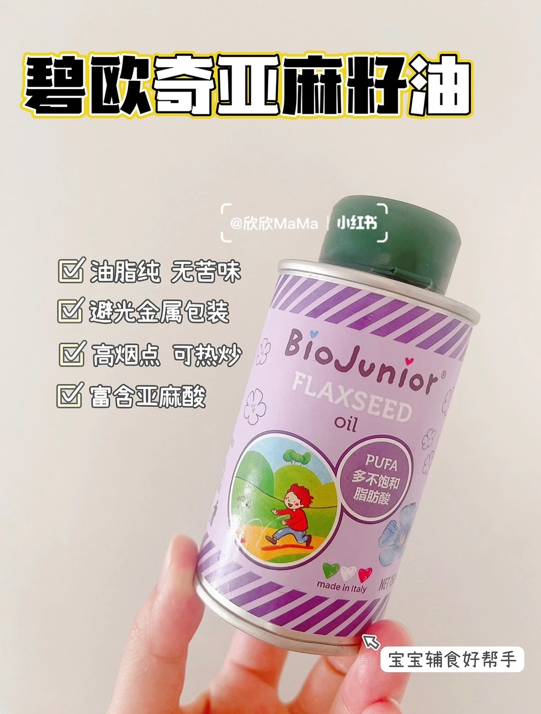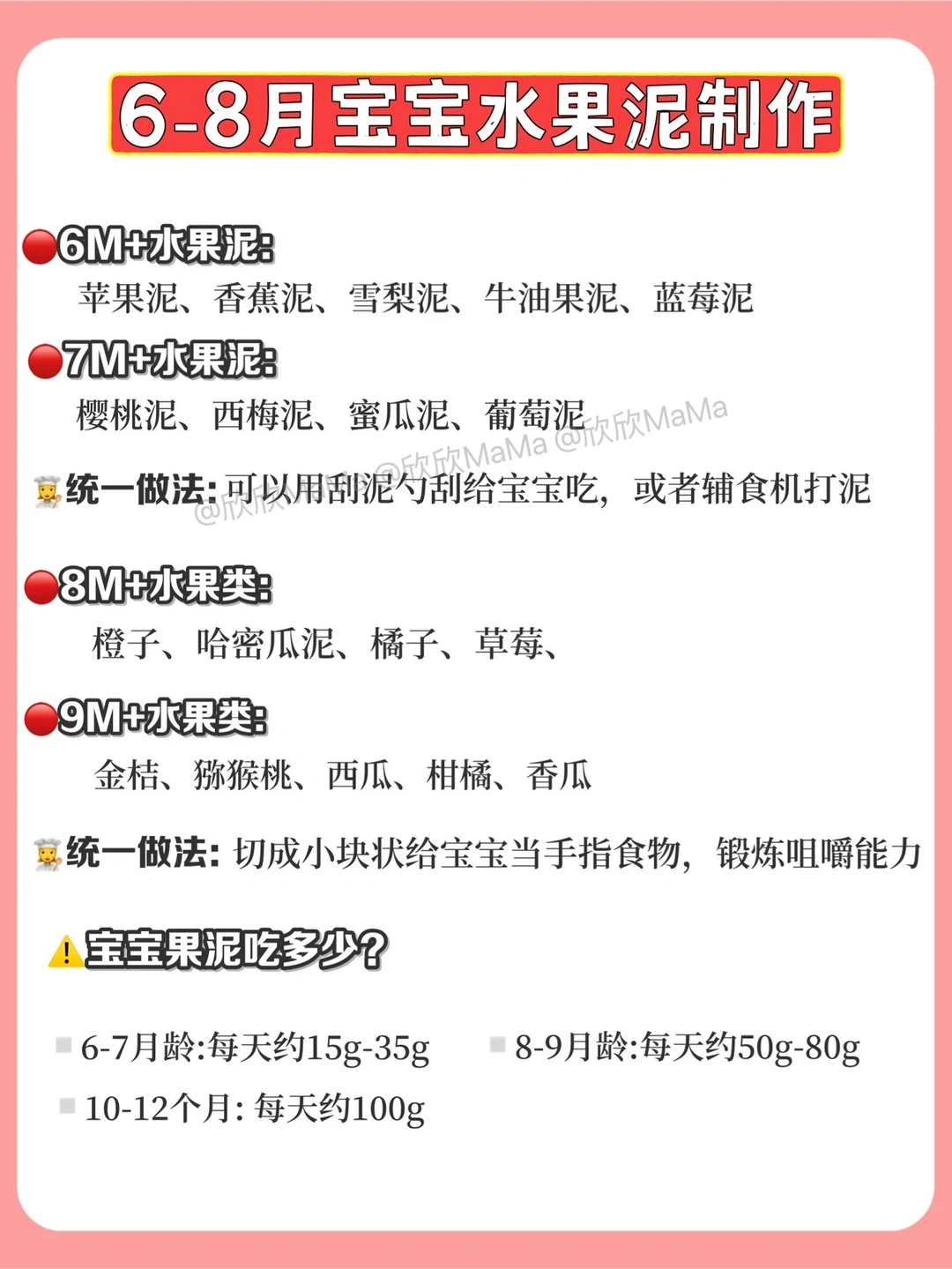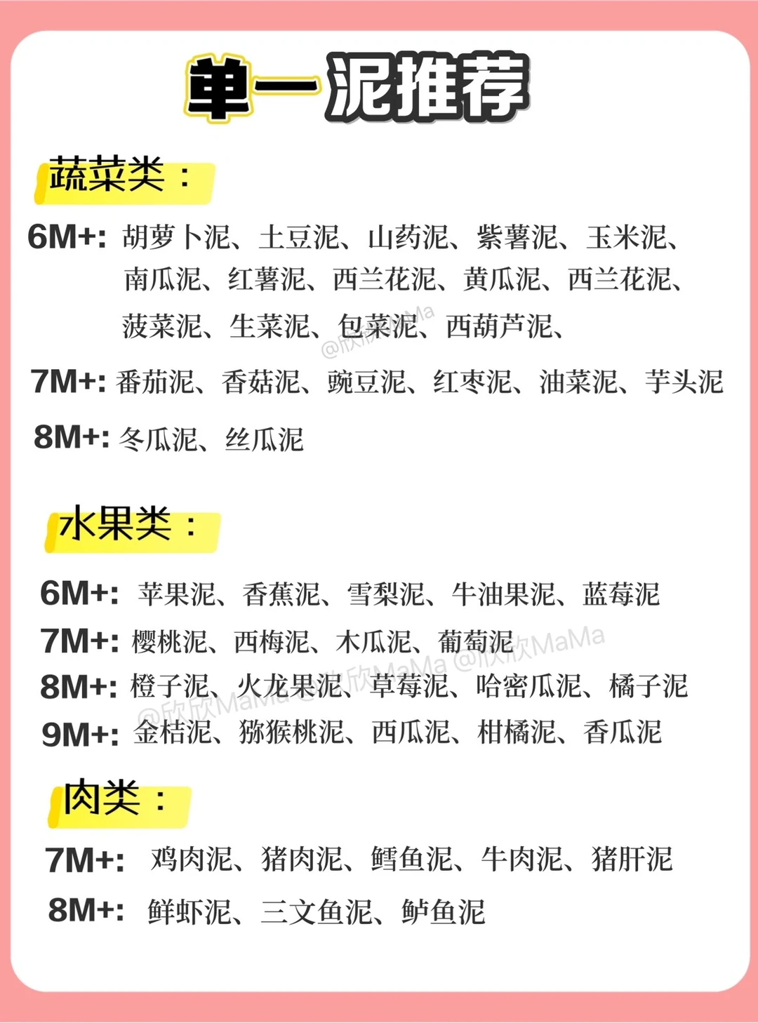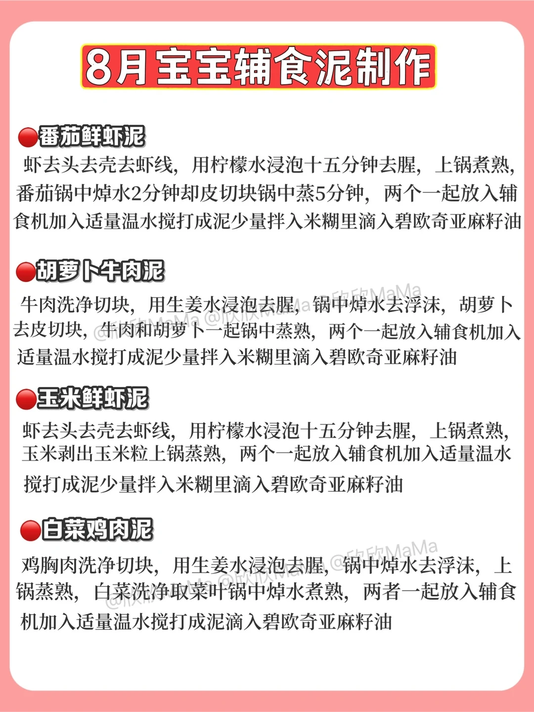 6月龄的宝宝就可以添加辅食了!但作为新手妈妈,辅食该怎么添加?6月龄应该吃什么?7月龄应该怎么吃?今天跟大家分享下近100款辅食泥以及做法,希望整理的对你们有用~ . 🔻米粉冲泡方法 宝宝第一口辅食应该选择高铁米粉 米粉冲泡步骤: 先倒60度温水到碗中,加入适量米粉, 静待30秒,用勺子顺时针搅拌均匀 . 🔻添加辅食顺序 宝宝添加高铁米粉一周后,就可以在辅食里添加蔬菜泥拉.刚开始从根茎泥开始,添加辅食2周后就可以添加辅食油啦! . ⚠️ 每添加一种食材3天排敏期,如辅食泥第一天1-2勺,第2天2-3勺逐渐增加拌入米粉里滴入核桃油搅拌食用,水果泥单独吃! . 🔻碧欧奇亚麻籽油 这款辅食油我也是一直在用的,它亚麻酸含量55%,是牛油果油的90倍,亚麻酸可在人体内转化为DHA,并且它的味道清淡,宝宝容易接受,烟点231度,无论是加进米粉里或者粥里、面条,或者热炒都可以。它是金属包装,能百分百完美避光,可以更好的保存保证营养的不流失,每次我做辅食我都会滴几滴,宝宝爱吃,用的放心. . 🔻6月龄宝宝辅食食谱推荐 胡萝卜泥 土豆泥南瓜泥 西兰花泥 山药泥 菠菜泥 红薯泥 包菜泥 西葫芦泥等 . 🔻7月龄宝宝辅食食谱推荐 ▫️单一泥 番茄泥 香菇泥 红枣泥 油菜泥 鸡肉泥 猪肉泥 鳕鱼泥 牛油泥 猪肝泥等 ▫️混合泥 红枣山药泥 胡萝卜鸡肉泥 香菇鸡肉泥 番茄鳕鱼泥 红薯猪肉泥 番茄牛油泥 玉米红枣泥 土豆菠菜泥 胡萝卜土豆泥等 . 🔻8月龄宝宝辅食食谱推荐 ▫️单一泥 鲜虾泥 三文鱼泥 鲈鱼泥 冬瓜泥 丝瓜泥等 ▫️混合泥 番茄鲜虾泥 西兰花牛肉泥 玉米鲜虾泥 白菜猪肉泥 三文鱼番茄泥等 . 整理的资料希望对你们有用,有问题也可以评论区留言哦! 💡关注我带您解锁更多辅食制作 6月龄宝宝辅食|7月龄宝宝辅食|8月龄宝宝辅食|9月龄宝宝辅食|宝宝辅食泥