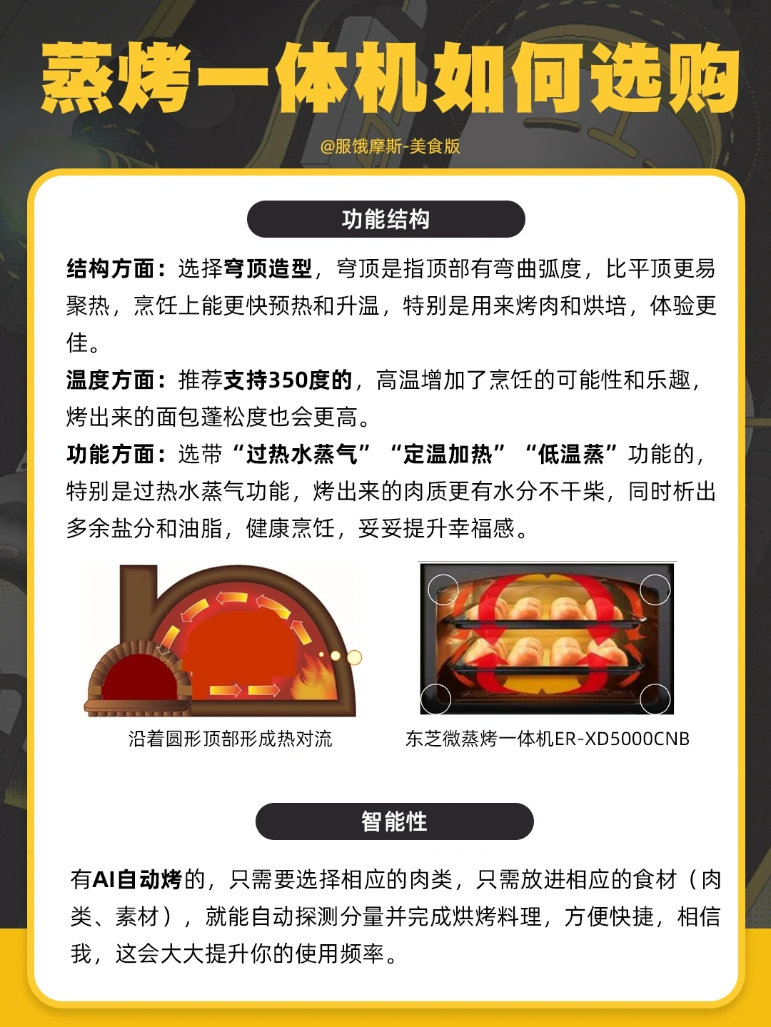 🎈功能方面:选带“过热水蒸气”“定温加热”“低温蒸”功能的,特别是过热水蒸气功能,烤出来的肉质更有水分不干柴,同时析出多余盐分和油脂,健康烹饪,妥妥提升幸福感。