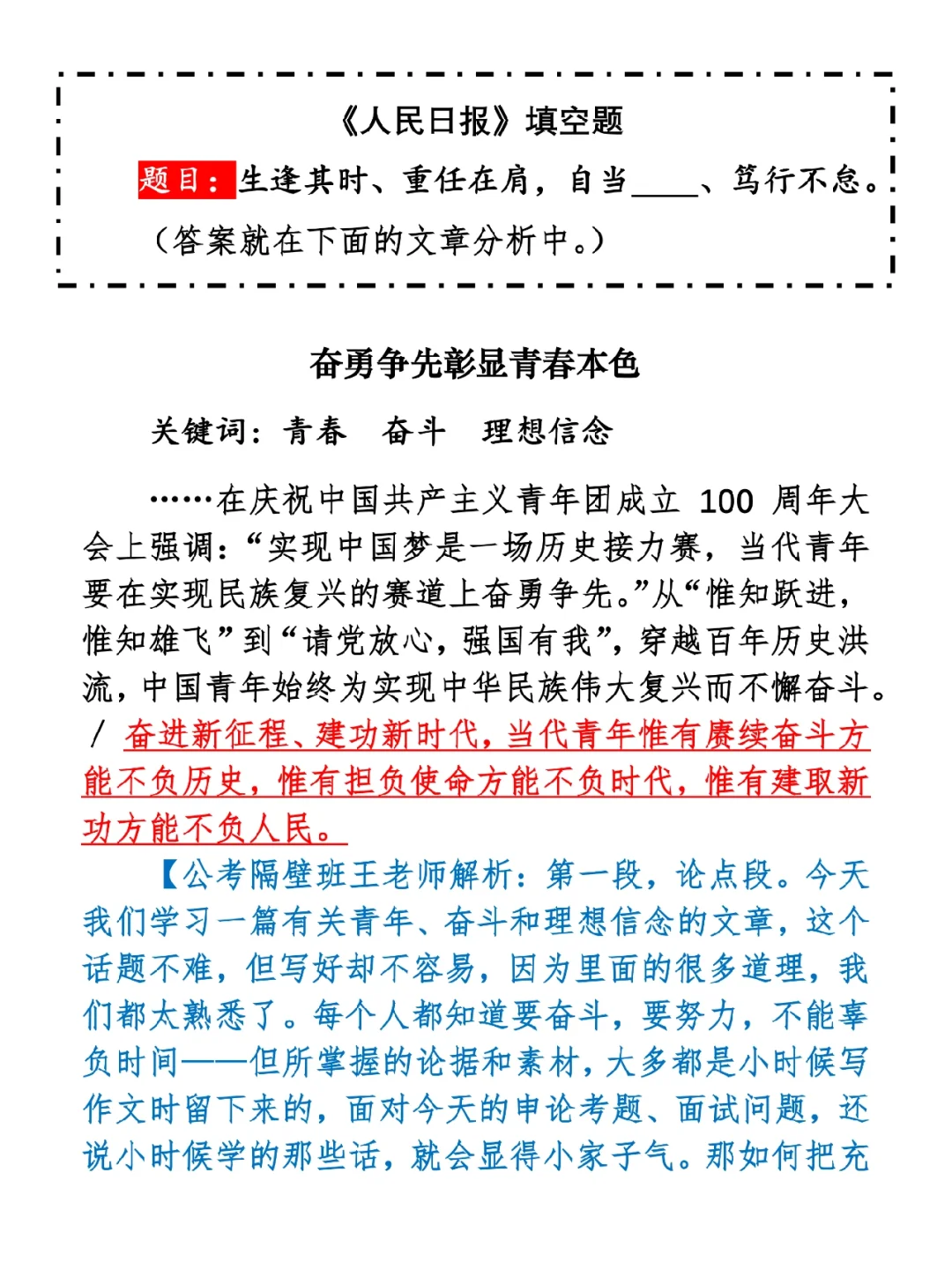 如何抄写:每天的抄写文章以图片形式发在“公考隔壁班王老师”账号,红色字是重点句和结构句,黑色字是正文,蓝色字是解析,大家抄写时不必抄蓝色字。建议先通读全文(包括蓝色解析部分),做到心中有数再开始抄写,效果会更好。