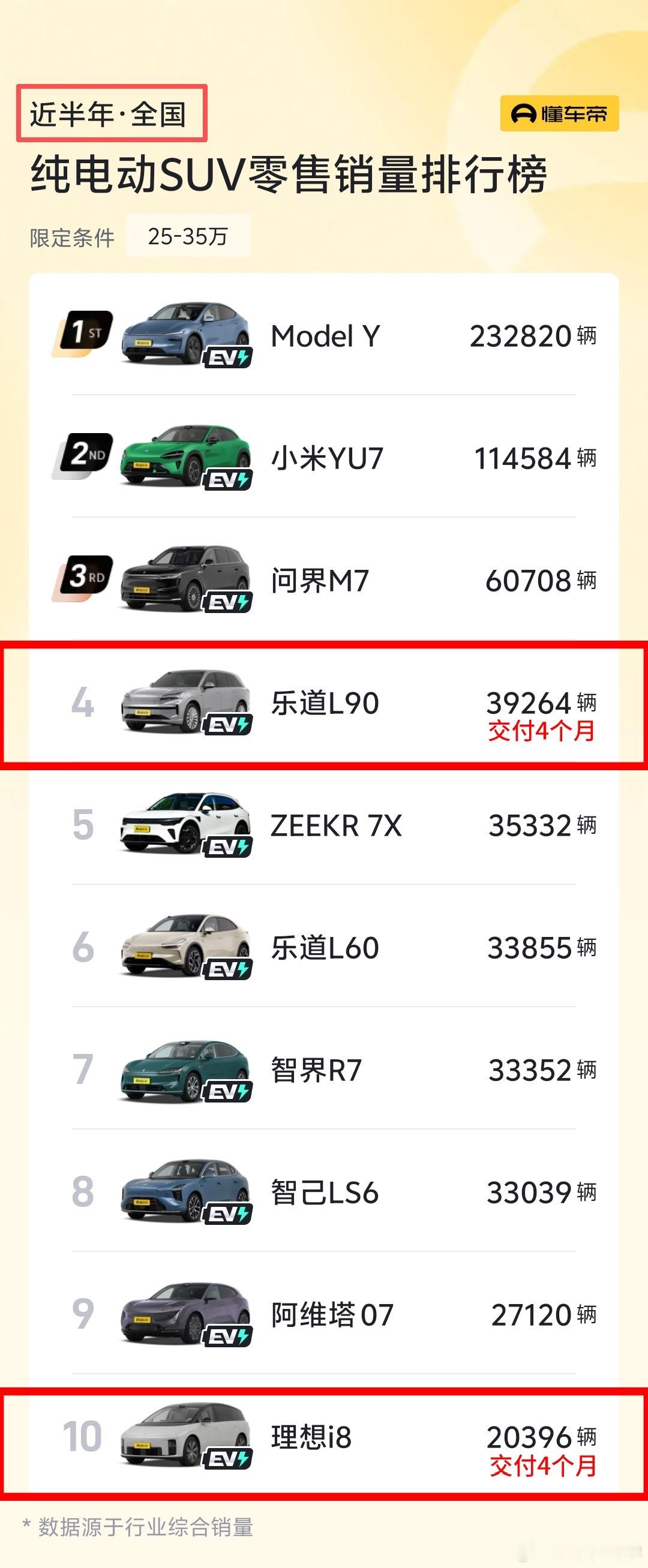 乐道L90,在目前这个逆势环境,大趋势销量下降的环境中干了啥?答案是啥也没干。既没有降价换销量。也没有搞特别的促销。然后乐道L90就稳居销量榜第4名,还是用仅交付4个月的成绩,干了一票交付半年的车型!要知道到今年下半年进入9月之后,地方补贴退坡了,整个车市一下转凉,行业当中有多少品牌扛不住,降价稳销量,乐道L90价格稳如老狗,竟然还干到了大型SUV前3的位置,累计销量是同期上市理想i8的两倍,对,几乎就是两倍。有人说你不要沾沾自喜,看前面还有更厉害的选手。没错,华为问界M8M9两个大山在前,乐道在后,差距也没有想象中大,考虑到乐道和华为的品牌势能完全不在一个档次,这个结果我相信大家也能接受吧?再考虑一下乐道L90的均价已经基本上和奥迪在一个档次了,谁再跟我说乐道是平价品牌,是不是有点不尊重自己国人的品牌努力向上的大好势头?大环境向下的情况下,乐道在向上是不是显得有点尤为可贵?接下来就是稳住销量势头,继续向大哥问界M89双雄看齐的节奏,乐道还有什么牌呢?L80行业颠覆性大五座明年就来,端到端上车智能驾驶体验持续增加,换电站持续增加,换电站电池数量翻倍,这个春运的乐道车主出行体验,又会有断代性的优势!作为创世版乐道L60车主的我,有点期待这个节奏了。新能源汽车
