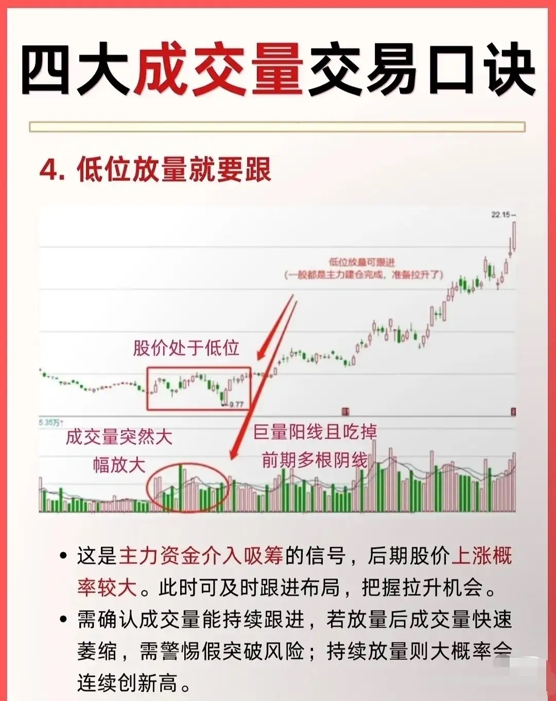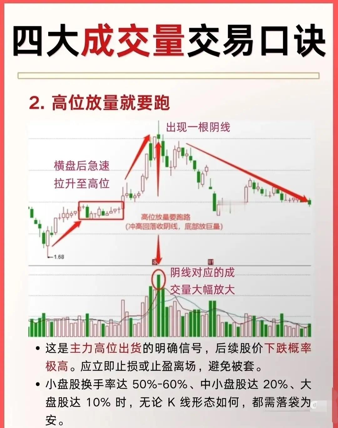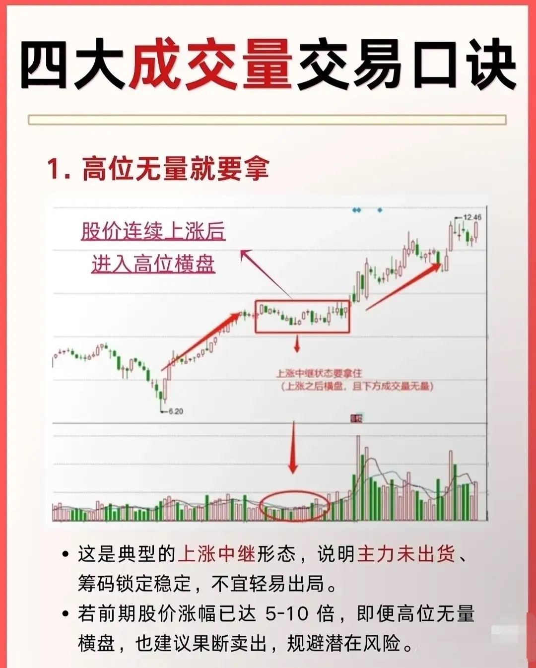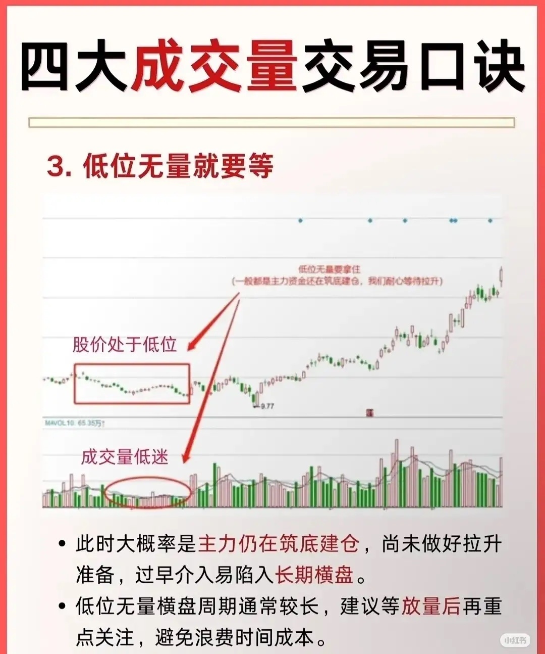 四大成交量交易口诀围绕不同位置(高位/低位)与成交量状态(无量/放量)的组合,总结了对应的股票交易策略:第一条是“高位无量就要拿”。当股价连续上涨进入高位横盘时,若呈现无量状态(即成交量低迷),属于典型的上涨中继形态——说明主力未出货、筹码锁定稳定,一般不宜轻易出局。但如果前期股价涨幅已达5-10倍,即便高位无量横盘,也建议果断卖出以规避潜在风险。第二条是“高位放量就要跑”。若股价先横盘后急速拉升至高位,随后出现阴线且对应成交量大幅放大,这是主力高位出货的明确信号,后续股价下跌概率极高,应立即止损或止盈离场。同时需注意换手率标准:小盘股换手率达50%、中小盘股达20%、大盘股达10%时,无论K线形态如何,都需落袋为安。第三条是“低位无量就要等”。当股价处于低位且成交量低迷时,大概率是主力仍在筑底建仓、尚未做好拉升准备,此时过早介入易陷入长期横盘。由于低位无量横盘周期通常较长,建议等成交量放大后再重点关注,避免浪费时间成本。第四条是“低位放量就要跟”。若股价处于低位且成交量突然大幅放大(如巨量阳线吃掉前期多根阴线),这是主力资金介入吸筹的信号,后期股价上涨概率较大,可及时跟进布局以把握拉升机会。但需确认成交量能持续跟进——若放量后成交量快速萎缩,需警惕假突破风险;若持续放量,则大概率会连续创新高。