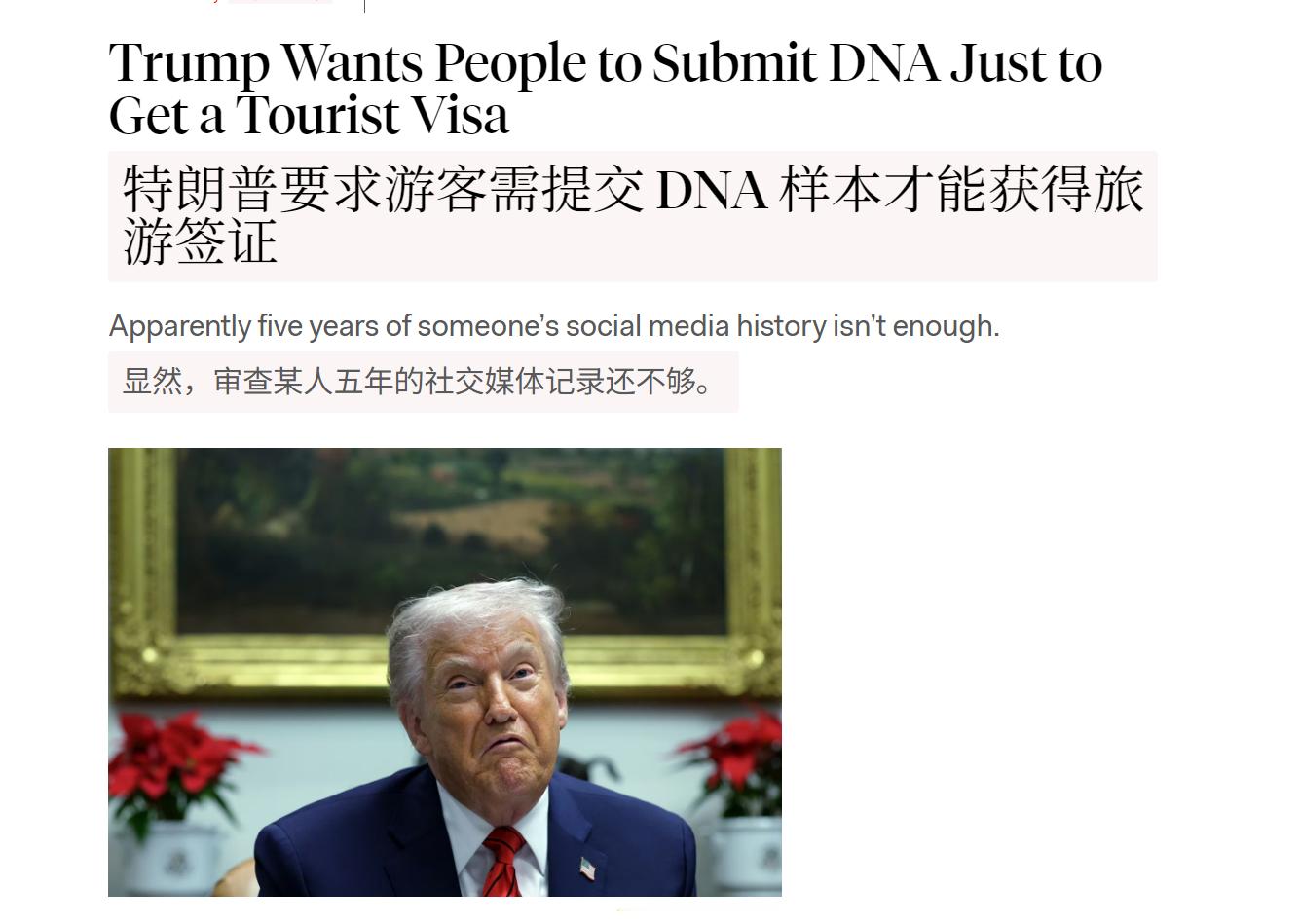 🔻据 NBC 报道,美国国土安全部拟要求所有持旅游签证入境者提交 DNA 样本。海外新鲜事热点现场