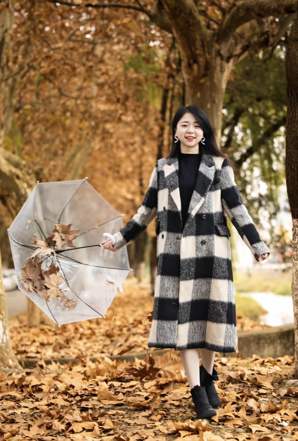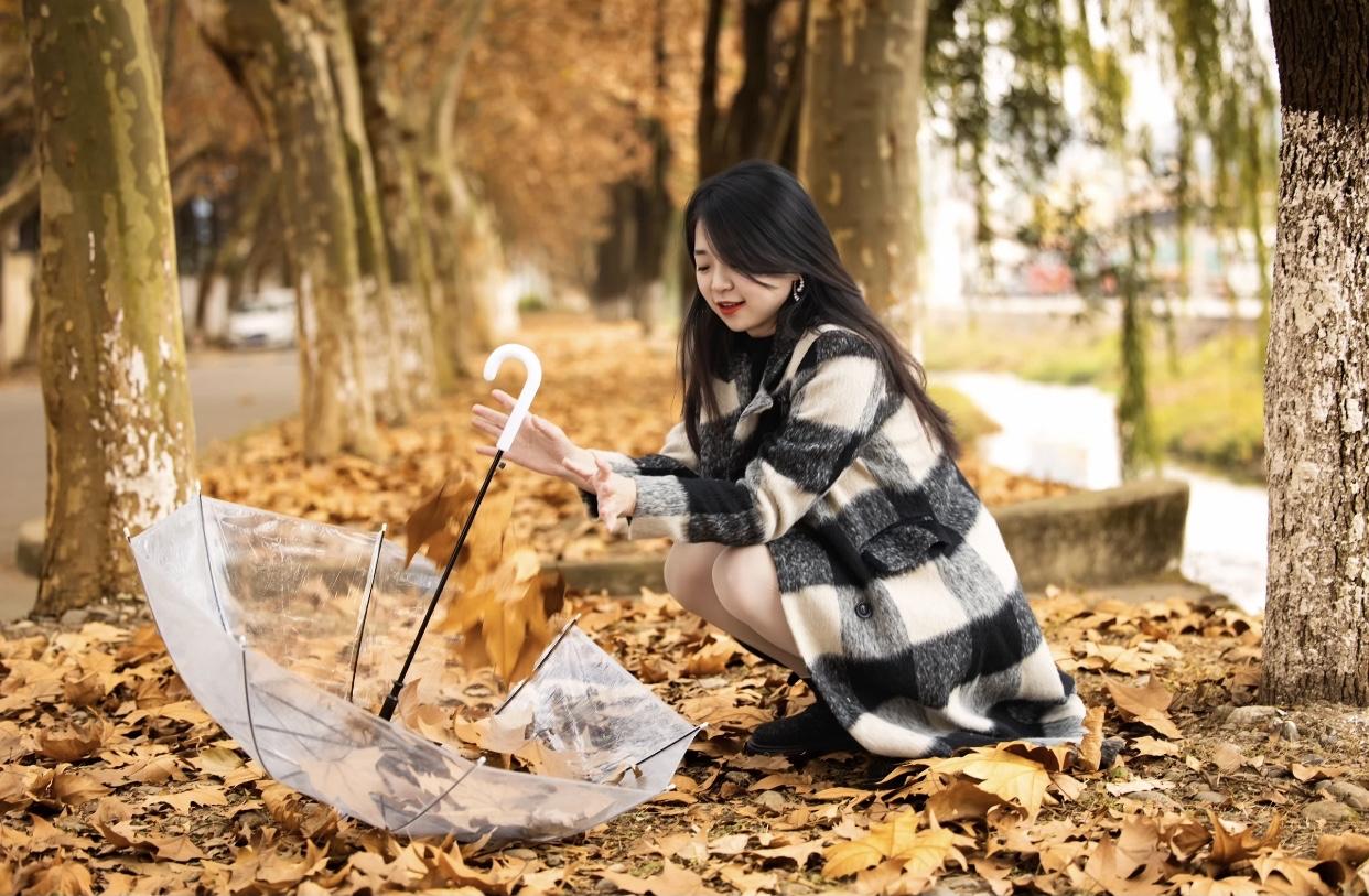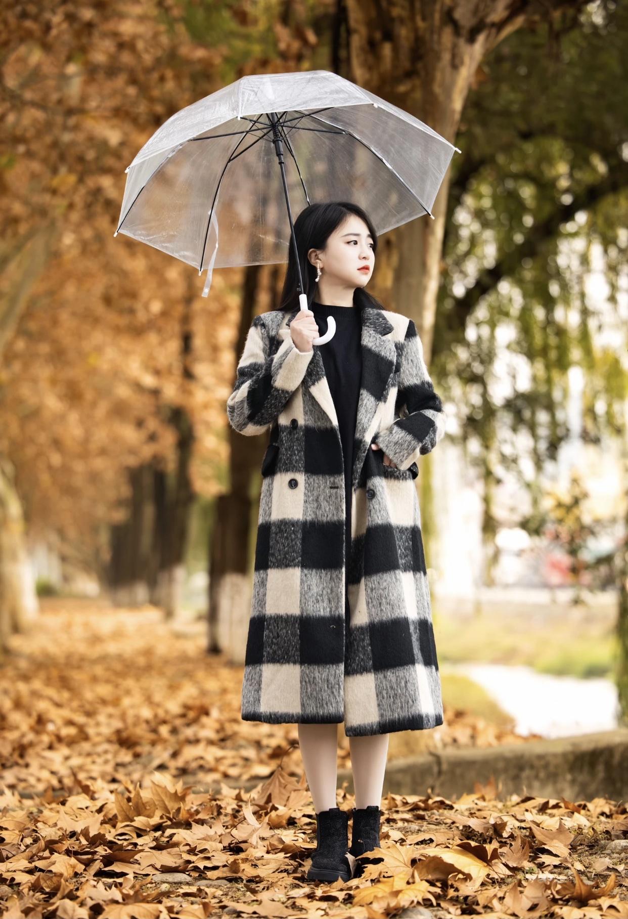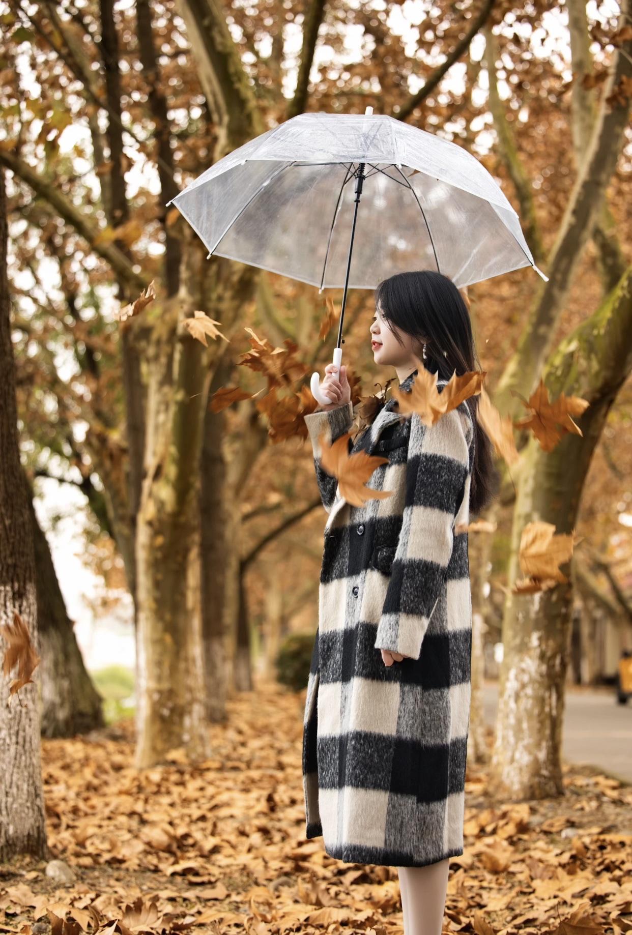 秋日漫步,黑白格纹大衣搭配透明伞,优雅动人。