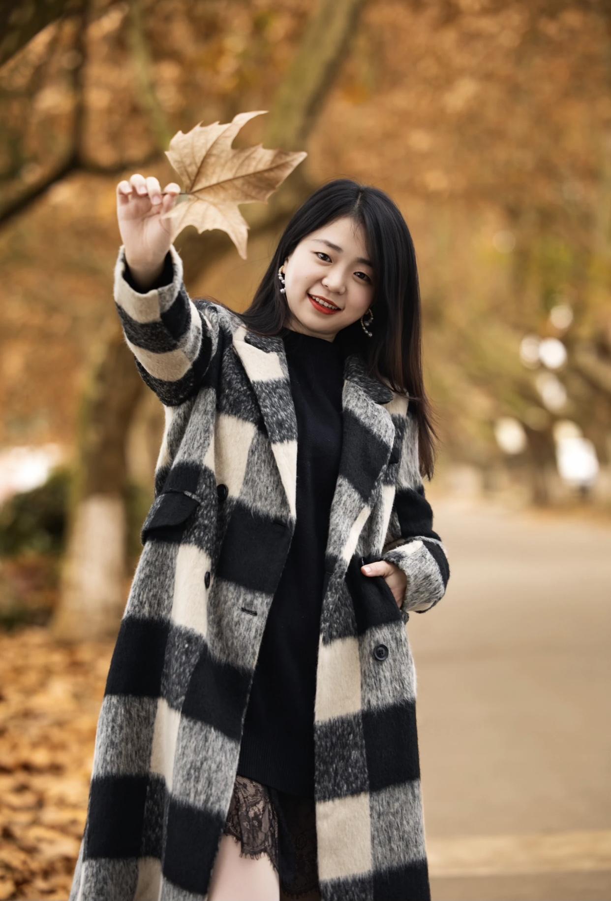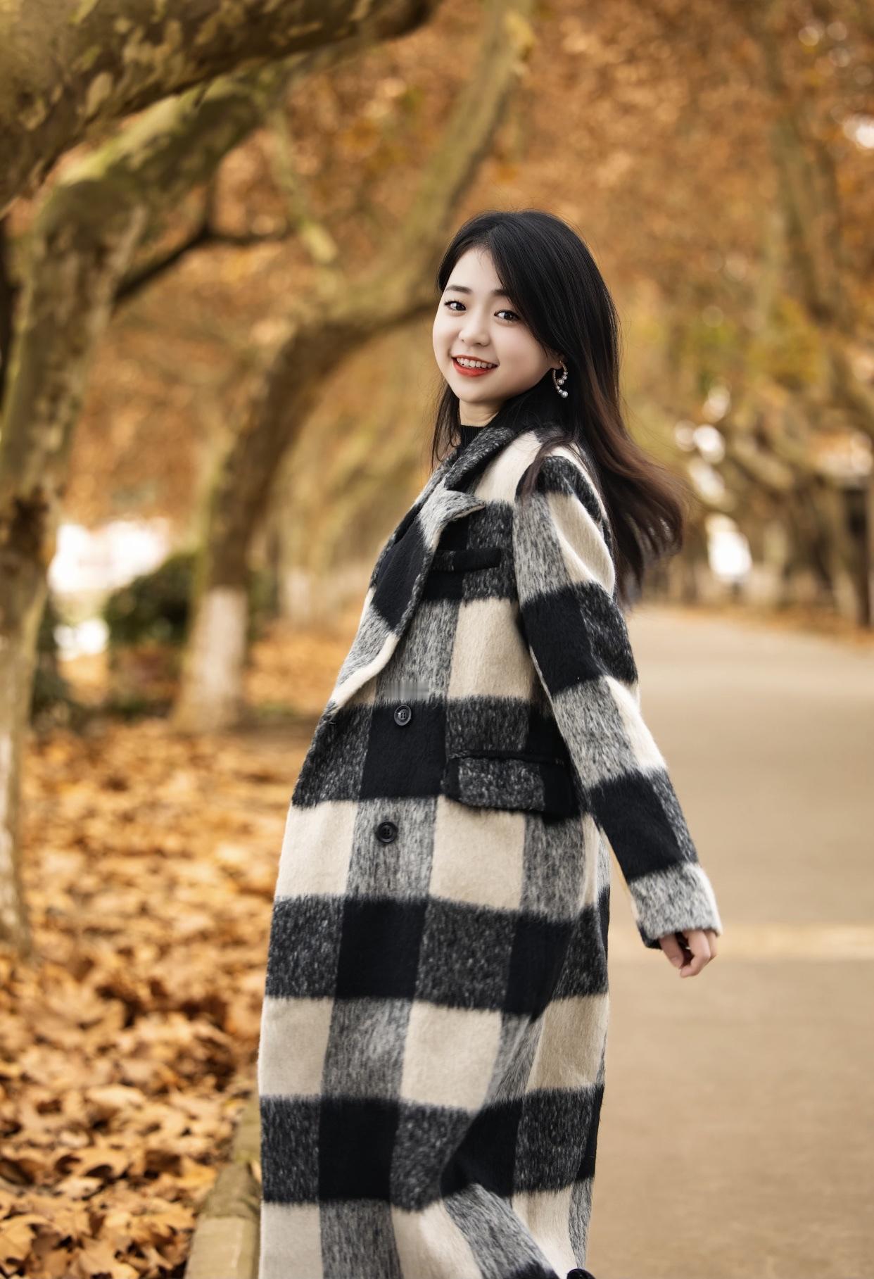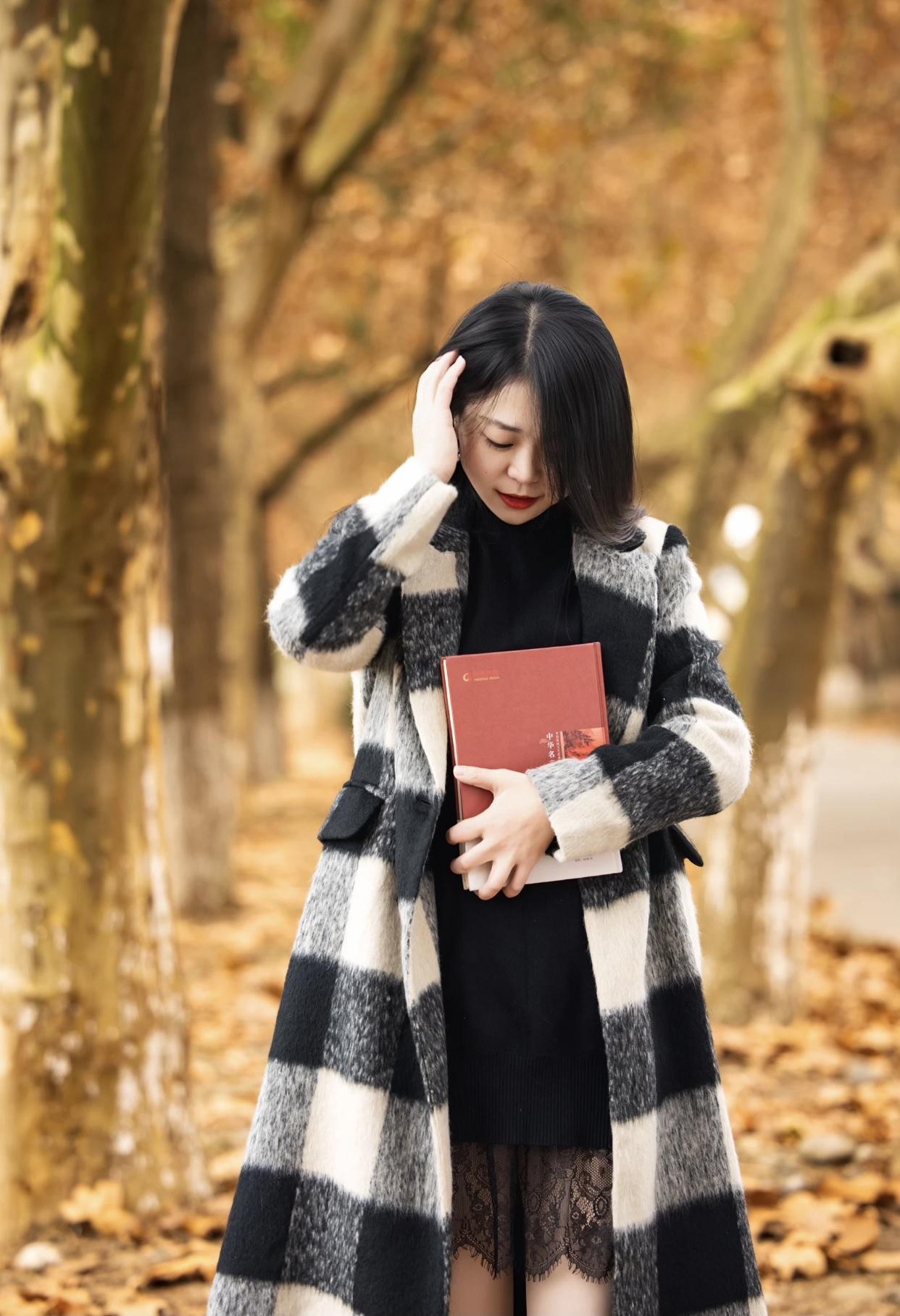 秋日漫步,黑白格纹大衣搭配透明伞,优雅动人。