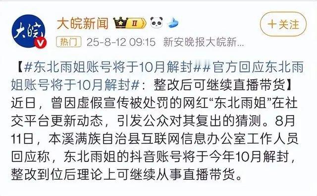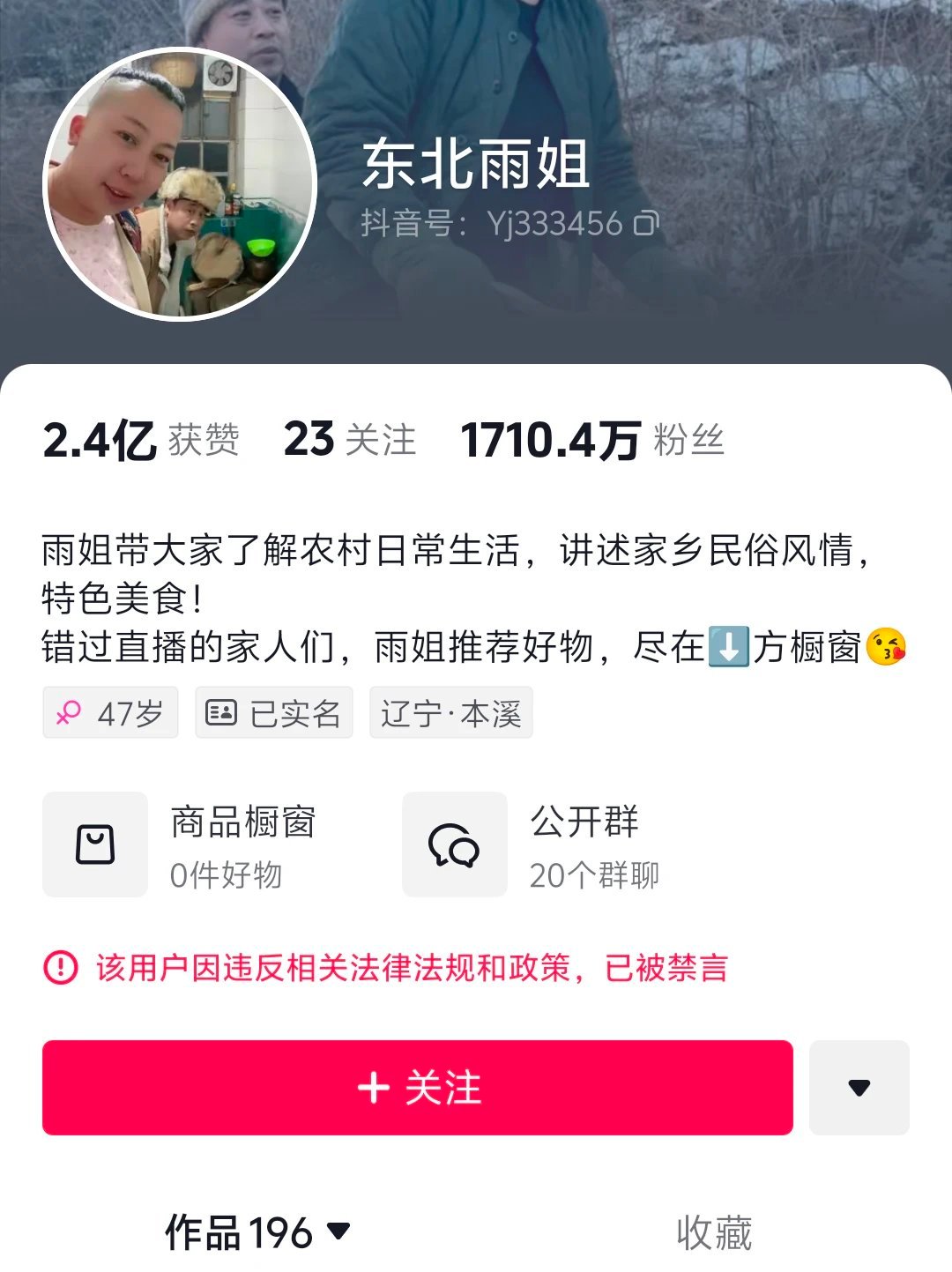 东北雨姐转世账号被关闭东北雨姐利用小号雨(记录生活)试图复出,昨天视频刚露头不到3秒,账号就被封!目前东北雨姐账号还在封禁中,粉丝从2000多万已经掉到1710万。东北雨姐的复出之路充满波折,之前有某官方回应,东北雨姐抖音账号将在10月解封,整改后理论上可以直播带货,但是现在已经11月份平台并没有原谅雨姐虚假宣传,最近东北雨姐也是频繁试探平台底线,利用小号雨(记录生活)试图复出,之前都是用气遮挡面部,昨天发布新视频正式露脸,没有想到今天账号就被封了。其实某地官方态度已经很明确,在整改后可以让东北雨姐继续网络生涯,但是平台遵循更多网友心声,还是没有解封之意,不过可以看出东北雨姐的豁达与人脉关系,也跟东北雨姐商业布局有关。1、东北雨姐本身就是本溪人,而她的商业发展一直也没有离开本溪,从她的视频拍摄地到雨姐电商孵化基地都在本溪,她对于本溪的经济有一定的贡献,她所在的拍摄地村庄是唯一有路灯的,联合调查组对东北雨姐进行调查,没有发现她偷税漏税,这对于没有监管的网络直播卖货很不容易。2、东北雨姐带货翻车,在这之前她还在为盘锦稻田蟹宣传,虽然引起非议,但是整个视频是公益性质的。带货的企业是朝阳的,这家企业离开东北雨姐以后已经无法支付罚款了!3、东北雨姐在本溪建了一个电商孵化基地,本意也是要带动本溪市电商产业发展,如果没有粉条事件,可以看见东北雨姐已经开始朝老板转型,当然也是因为东北雨姐发展太顺了,并且没有mcn公司,才会在处理这些问题上出现严重偏差。网络平台不能允许有污点的人继续发展,东北雨姐利用小号复出也引起了平台的关注,根据媒体报道,平台管理方已经明确大众举报后平台会严肃处理,这也导致东北雨姐利用小号复出后再次被封。看来东北雨姐想继续网络生涯已经没有可能,平台允许她的声音出现但是不允许露脸,地方的支持也只能是支持,目前疯狂小杨哥也是以幕后老板身份扶持其他主播保持直播,可能东北雨姐未来只能做幕后工作了!