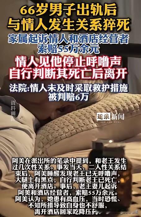 广西平南县人民法院对此案作出了一审判决 。法院认定66岁男子周某自身突发急性心肌梗死离世,承担主要责任;情人庄某承担10%的次要责任,赔偿周某妻儿6.2万余元;涉事酒店无责。 法院审理认为,庄某虽没法预见周某会突发疾病,但她发现周某异常后,未及时拨打120急救电话或采取紧急救治措施,仅凭个人判断就认定周某死亡并径直离开,致使周某错过最佳救治时机 。此外,庄某明知周某是有妇之夫仍保持不正当关系,违背公序良俗,存在一定过错 。而酒店已尽合理安全保障义务,周某的死亡和酒店服务无因果关系,故无需担责 。心梗赔偿