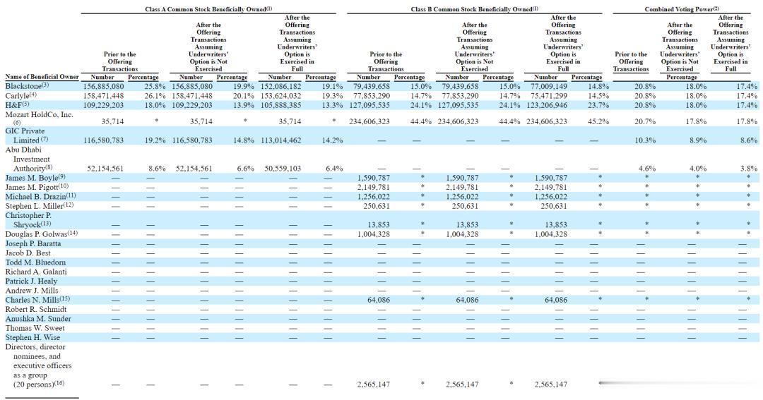 IPO前,Blackstone持有25.8%的A类股,及15%的B类股;Carlyle持有26.1%的A类股,14.7%的B类股;H&F持有18%的A类股,及24.1%的B类股;MozartHoldCo持有44.4%的B类股;