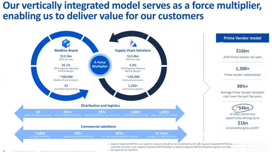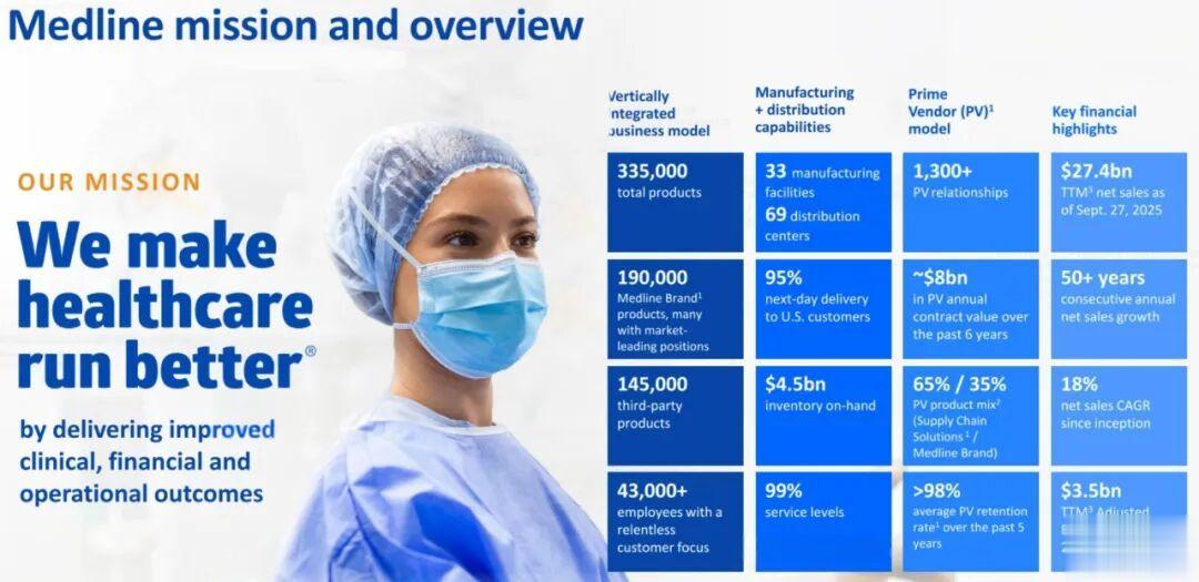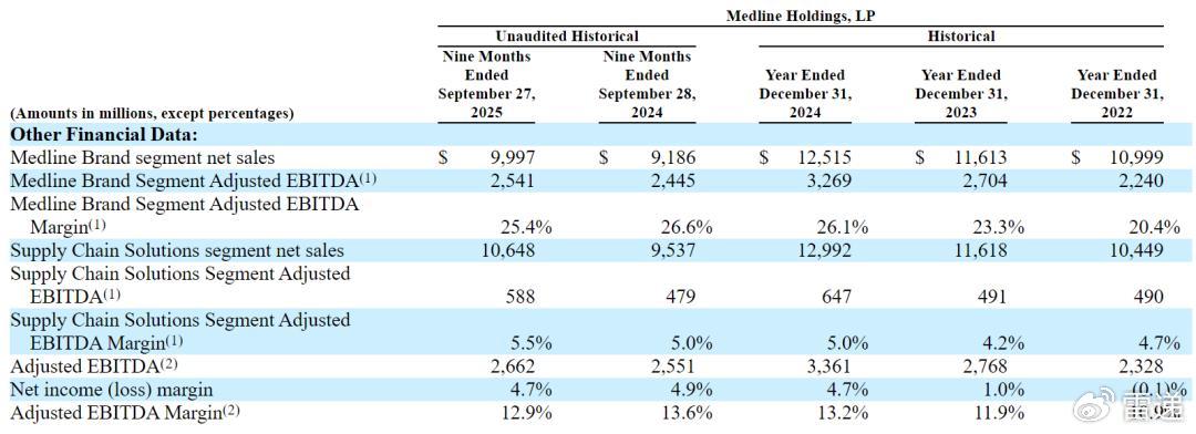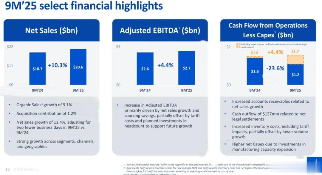 Medline在2025年前9个月AdjustedEBITDA为26.62亿美元,AdjustedEBITDAMargin为12.9%。