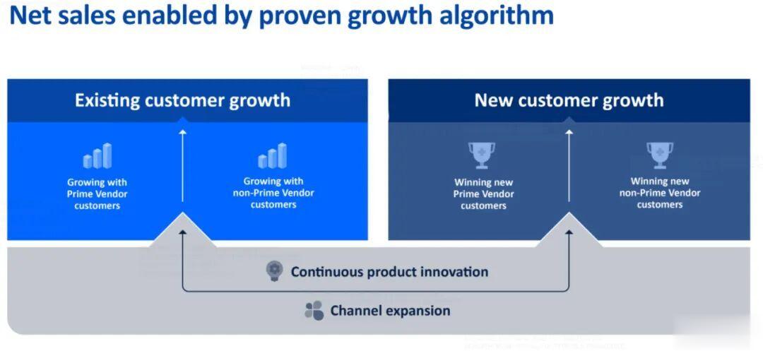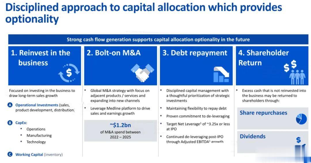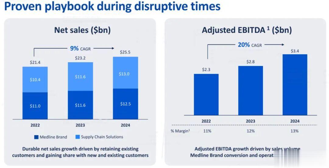 Medline在2022年、2023年、2024年AdjustedEBITDA分别为23.28亿美元、27.68亿美元、33.61亿美元;AdjustedEBITDAMargin分别为10.9%、11.9%、13.2%。