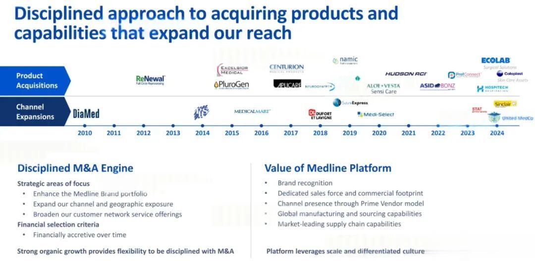 Medline是一家围绕“医疗耗材+供应链解决方案”的综合平台型供应商,制造和分销的产品包括伤口管理、皮肤管理、麻醉、手套、泌尿外科、失禁管理、造口管理、耐用医疗设备、防感染产品等。