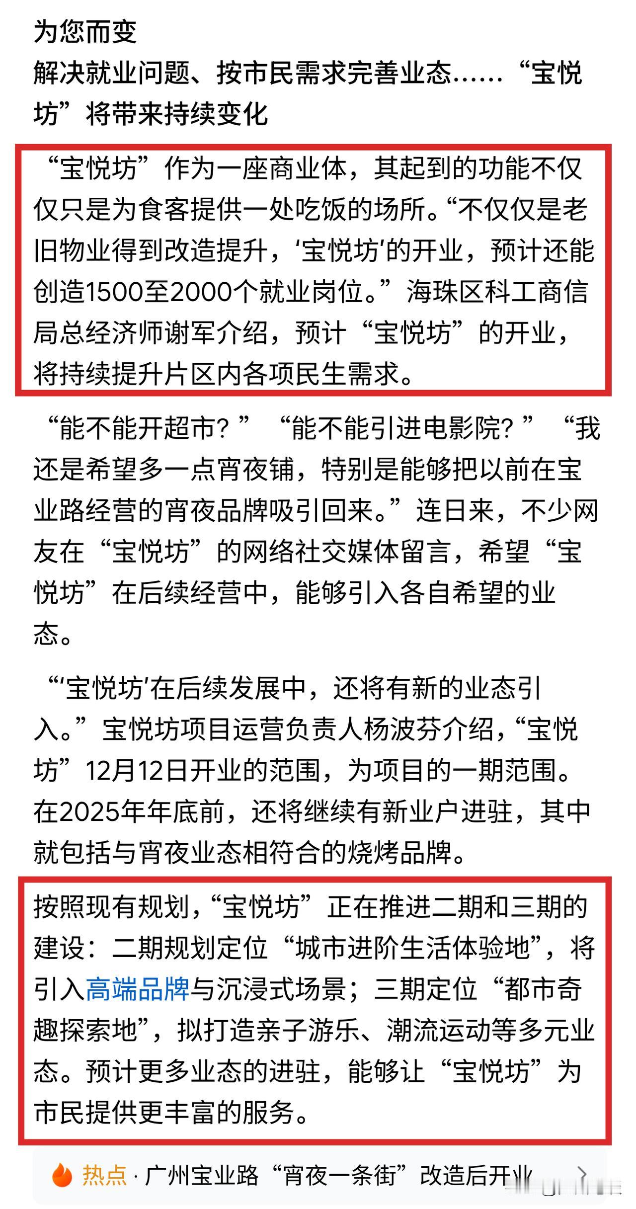 【宝业路王者归来】中国低效用地改造看广州,广州低效用改造看海珠,海珠低效用地升级看宝业路! 历经986个日日夜夜的期待,广州海珠区宝业路宵夜一条街升级改造王者归来! 宝业路改造不仅仅是租约到期大排档的拆迁而已,而是上升到了全区,乃至全广州,全国旧城低效用地改造的高度了。 广州作为全国低效用地改造的试点城市,拥有众多旧城区,还有数以百计的城中村。 此次宝业路改造,正是低效用地改造的一个典型,通过统一规划,分期开发,逐步落地的流程。宝业路改造后的新名字为宝悦坊。 现在仅仅是一期开业,后面还有二期,三期。 宝业路改造,实现了老城区黄金位置捧着金饭碗要饭的尴尬局面。 通过大排档到商场的软硬件升级,做大做强,品质实现质的飞跃,土地经济利益也实现了最大化。在相同的土地上,创造更大的价值。实现了低效用地的改造,堪称一大典范。为海珠,为广州,为全国旧城改造,低效用地改造摸索出一条可行的路子。 同样的,老城区的居民,如果不喜欢不习惯这样的升级改造,可以选择更适合自己的环境。例如退休后养老,可以选择附近的颐养院,还有郊区环境更好的养老院,例如从化太平镇的广州养老院,就是一个不错的选择。有住有养有医,幸福晚年生活。 时代在发展,老人家奉献的时代已经过去了,新时代留给更适合新时代的弄潮儿。 就连大宋朝建立后,赵康胤就让那些功臣武将去过花天酒地的幸福生活,置办大量田产,过起了富甲一方的生活。 道理大同小异。 当然了,这只是个人意愿下的选择而已。 旧城改造升级,已经箭在弦上不得不发。 老城区的新生活,生活成本上涨是必然的。