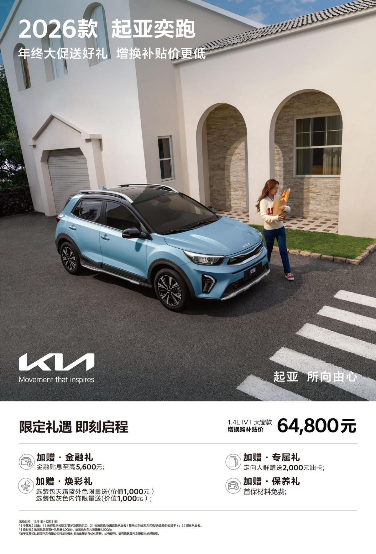 新手司机的“定心丸”!2026款奕跑,好开好停不焦虑 对于刚拿驾照或在拥挤城市中打拼的年轻人来说,一台“好开”的车远比其他都重要,而2026款起亚奕跑,正是缓解这份驾驶焦虑的理想选择。 它不仅拥有新增的“天霜蓝”外观和灰色内饰等时尚配色,更在驾控层面展现出对新手的极致友好。它拥有5.45米的极小转弯半径,配合轻盈精准的转向手感,无论是老旧小区的窄路掉头,还是商场地库的螺旋弯道,都能一把通过,从容不迫。停车更是它的强项,灵巧的车身尺寸加上倒车影像和BWS倒车雷达的双重辅助,让侧方停车和倒车入库变得像玩游戏一样简单。动力方面,1.4L发动机匹配IVT变速箱,输出线性平顺,告别顿挫感。 除了轻松的驾驭体验,购车过程也同样毫无压力,1.4L IVT天窗款增换购补贴价仅64,800元,配合至高5,600元的金融贴息,并且针对教师、医护及物流从业者等特定人群,还额外提供2,000元油卡补贴,让你不仅开得轻松,买得更轻松。