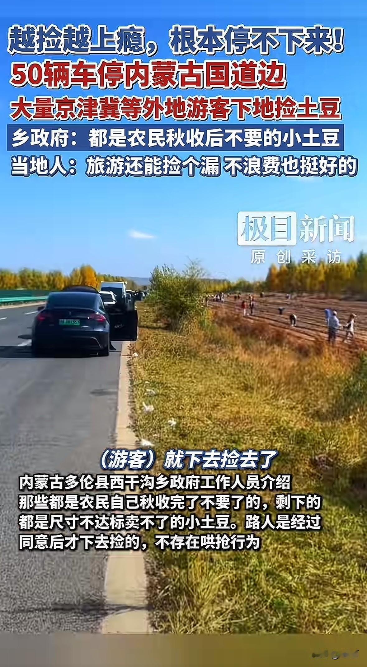 最近内蒙古国道边挺热闹,50来辆车停在304国道西干沟路段,不少京津冀牌照的车,路人都在路边地里捡土豆,后备箱都塞得满满当当。 乡政府说了,这些都是农民秋收后不要的小土豆,尺寸不达标卖不了,还有点机械遗漏的大的,路人都是问过同意才捡的,不是哄抢。 有游客说越捡越上瘾,还和人聊怎么吃,老乡还给袋子,挺热情。当地人也觉得挺好,游客捡漏体验生活,还不浪费粮食,路面宽也没挡道。 这事儿看着暖心,老乡实在,游客自觉。关键是守住了边界,先问再捡,不是理所当然去拿。比那些打着“捡秋”旗号乱薅东西的强多了,不浪费又添了旅行乐趣,这样的互动挺舒服。
