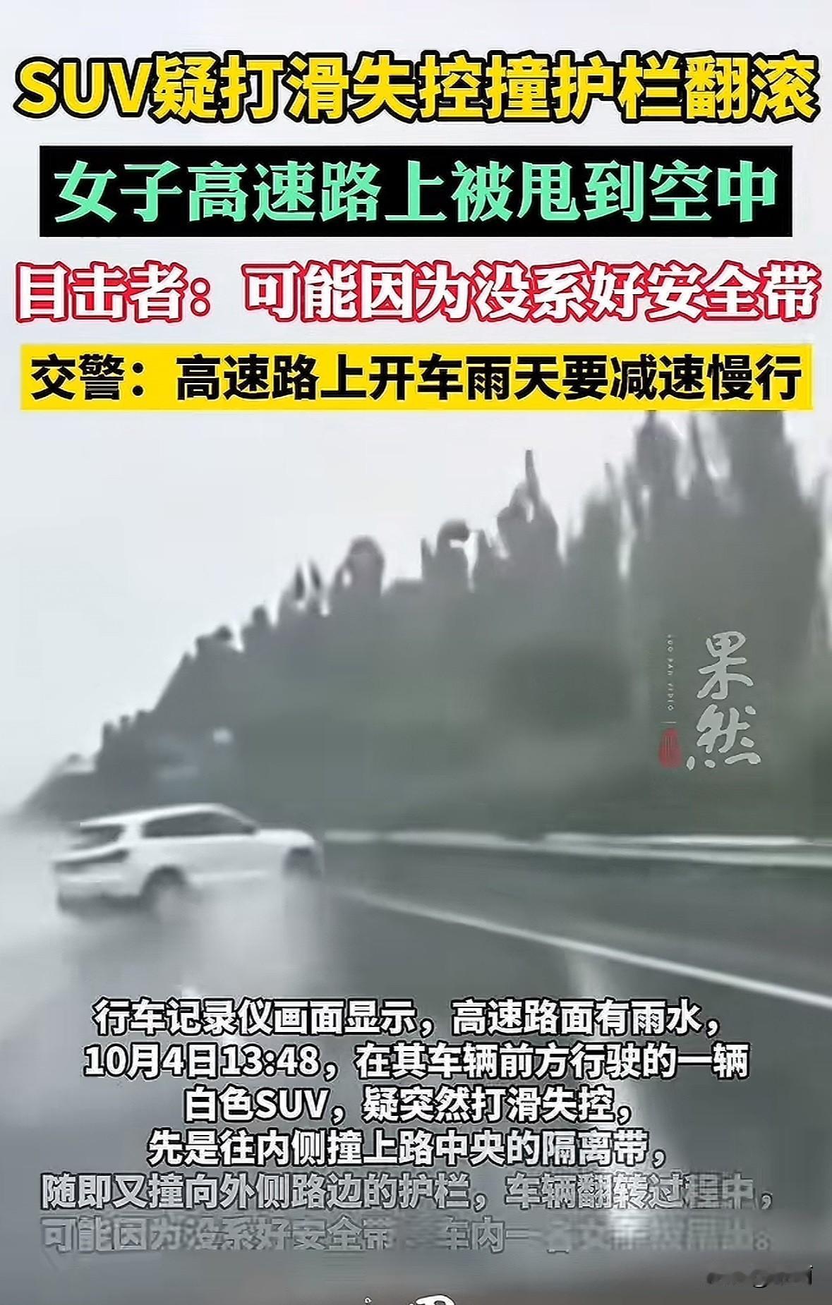 10月4日13点48分,G55二广高速山西晋中段,一辆白色SUV在有雨水的路面疑似打滑失控。先撞向路中央隔离带,又撞外侧护栏,车辆发生翻转。 行车记录仪拍着,车内一名女子好像没系安全带,直接被甩出车外。 10月6日记者问晋中高速交警,民警说这段高速涉及多个大队,发布视频的不是当事人,没法透露更多情况。 雨天高速路本来就滑,车速稍快就容易失控,这是基本常识。更关键的是安全带,这真是“生命带”,不管坐前排后排,上车就得系好。 这次事故看着太揪心,希望人没事。开车出门,安全永远是第一位的,不能有半点马虎。你们坐车会随时系好安全带吗?