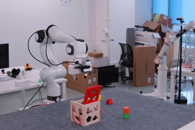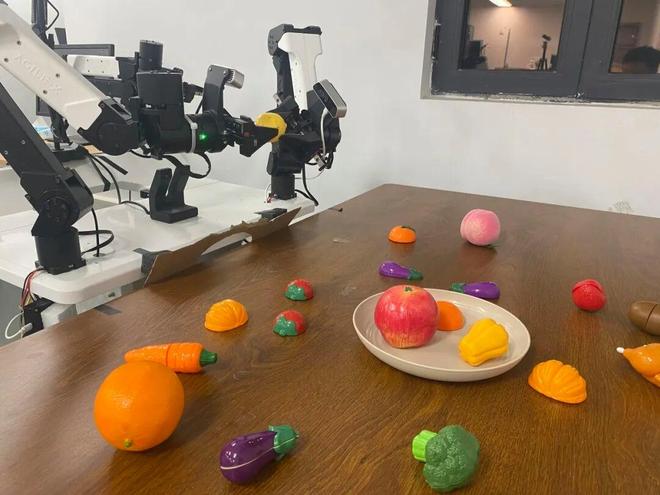 实验台上铺满五颜六色的水果模型、拼装玩具,团队最近的一个日常工作,就是像“带小孩”一样,教机器人如何“玩转”这些玩具。