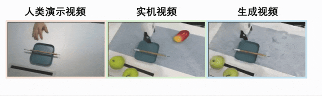 基于人类演示视频(左)和生成模型合成机械臂视频(右),最终部署在真机上(中)