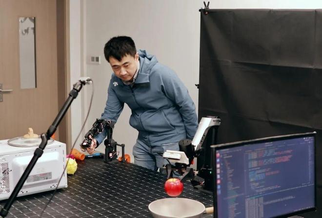 数据收集并不是一件容易的事。“现在具身智能领域最大的难题其实就是数据收集。一百条数据,大概只能支持机器人完成一个任务。”吴祖煊解释,传统的做法,需要工程师手把手教学,比如演示拿水杯、擦盘子,这不仅动作数据收集成本高昂,且面对不同场景、不同动作,人工收集更是耗时耗力。