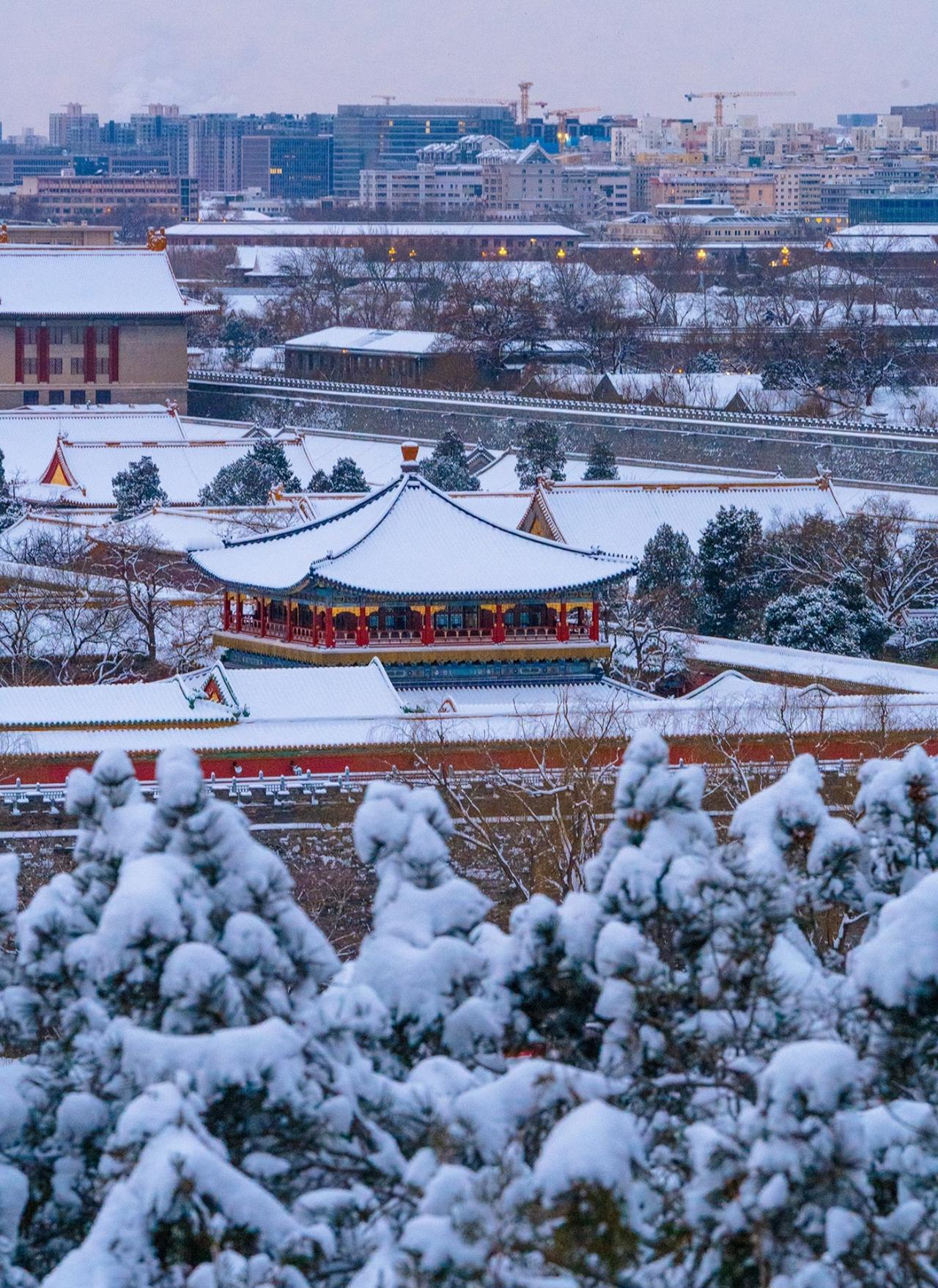 北京初雪后的景山山顶 紫禁城的雪国奇观 清晨六点,天还未完全亮 景山万春亭已站