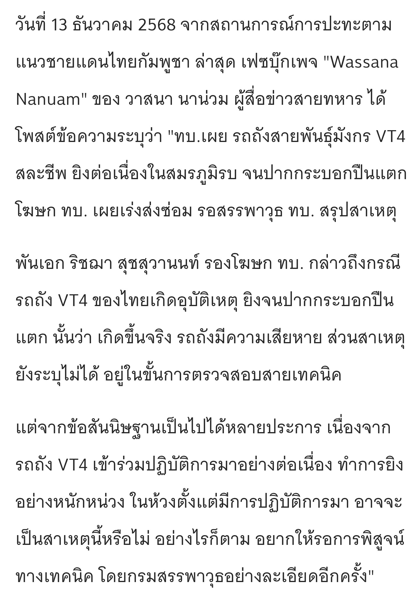 12月13日泰国媒体报道:“在与柬埔寨军队于边境地区发生的冲突中,一辆VT4坦克在持续射击后炮管受损。泰国陆军正在对此事进行调查。泰柬冲突泰国和柬埔寨均同意停火 泰国军事记者瓦萨娜·纳努安(Wassana Nanuam)在其Facebook主页“Wassana Nanuam”上发帖称:“陆军透露,一辆VT4坦克(绰号‘龙’)在战场上持续射击后炮管受损,导致车辆损毁。陆军发言人表示,维修工作正在进行中,目前正在等待陆军军械部门对事故原因的调查结果。”泰国陆军副发言人里查·苏查苏瓦农上校证实,这辆VT4坦克的炮管确实受损。坦克确实受到了损伤,但具体原因仍在技术调查中。但从初步推测来看,存在多种可能原因。由于 VT-4 坦克持续参加作战行动,并在行动期间进行高强度、频繁的射击,自行动开始以来一直处于高负荷使用状态,这是否构成事故原因之一,仍有待进一步确认。无论如何,仍希望等待陆军军械部门进行更加详细、全面的技术鉴定之后,再作出结论。”