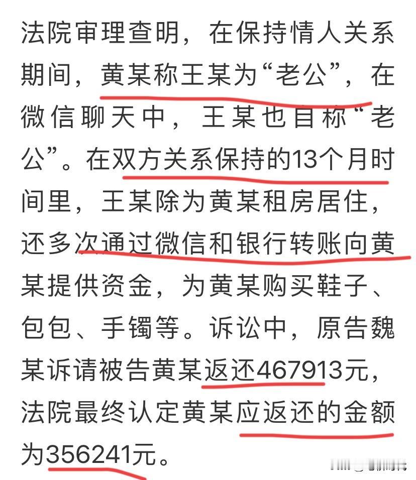 这就是拜金女代价!男子养小20岁情人13个月内豪掷35万余元,微信转账一笔接一笔。男子每晚都回家,从不在租房过夜,自以为做得天衣无缝,妻子不会怀疑了。 上海大哥王某44岁,在健身房认识了24岁的前台女子。两人很快发展成了“地下关系”。 这个王某也是多金,出手“大手笔”,给黄某租房住,买奢侈品等等,聊天记录里称“老公”。把这段关系推向了物质的深渊。 两人在一起13个月,平均一个月给近三万元,真不懂这种男人背着妻子给别人那么大方,到底图什么吗? 奸情被妻子发现后,一纸诉状告赢,法院判全额返还还要付利息,总计近47万元。 更绝的是,在法庭上王某认怂,同意老婆的诉求。 有人幼稚地认为,,家庭财产是夫妻双方共有的,一人一半,那男方赠予的一半应该归第三者。 既然是夫妻共同财产,单方是无权处置的。违反了“夫妻对共同财产有平等处理权”的法律规定。 这样恰恰给那些拜金女还有小三警示!就是要这样打击第三者,当然也要惩罚出轨者。不能让渣男全身而退!