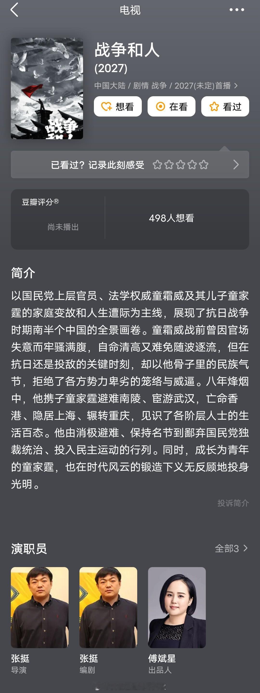 🍉:白敬亭、于和伟、李兰迪、杜江《战争和人》白敬亭资源真好,于和伟给他做配,豆瓣主页的剧情简介是以父亲为主线,结果现在变成以儿子为主视角。原著儿子出场是14岁,白敬亭怎么演?而且于和伟更有正剧底盘吧。。。
