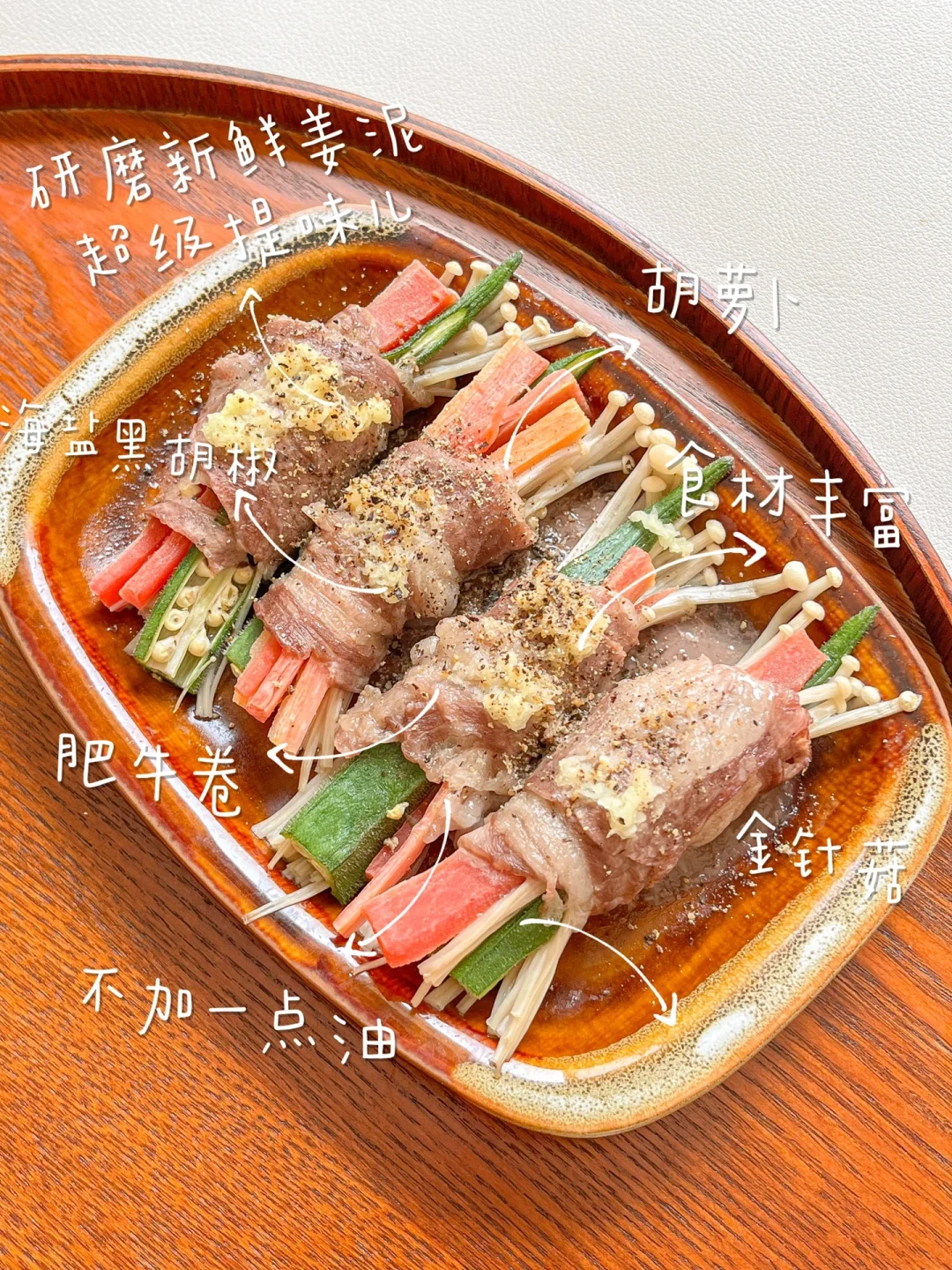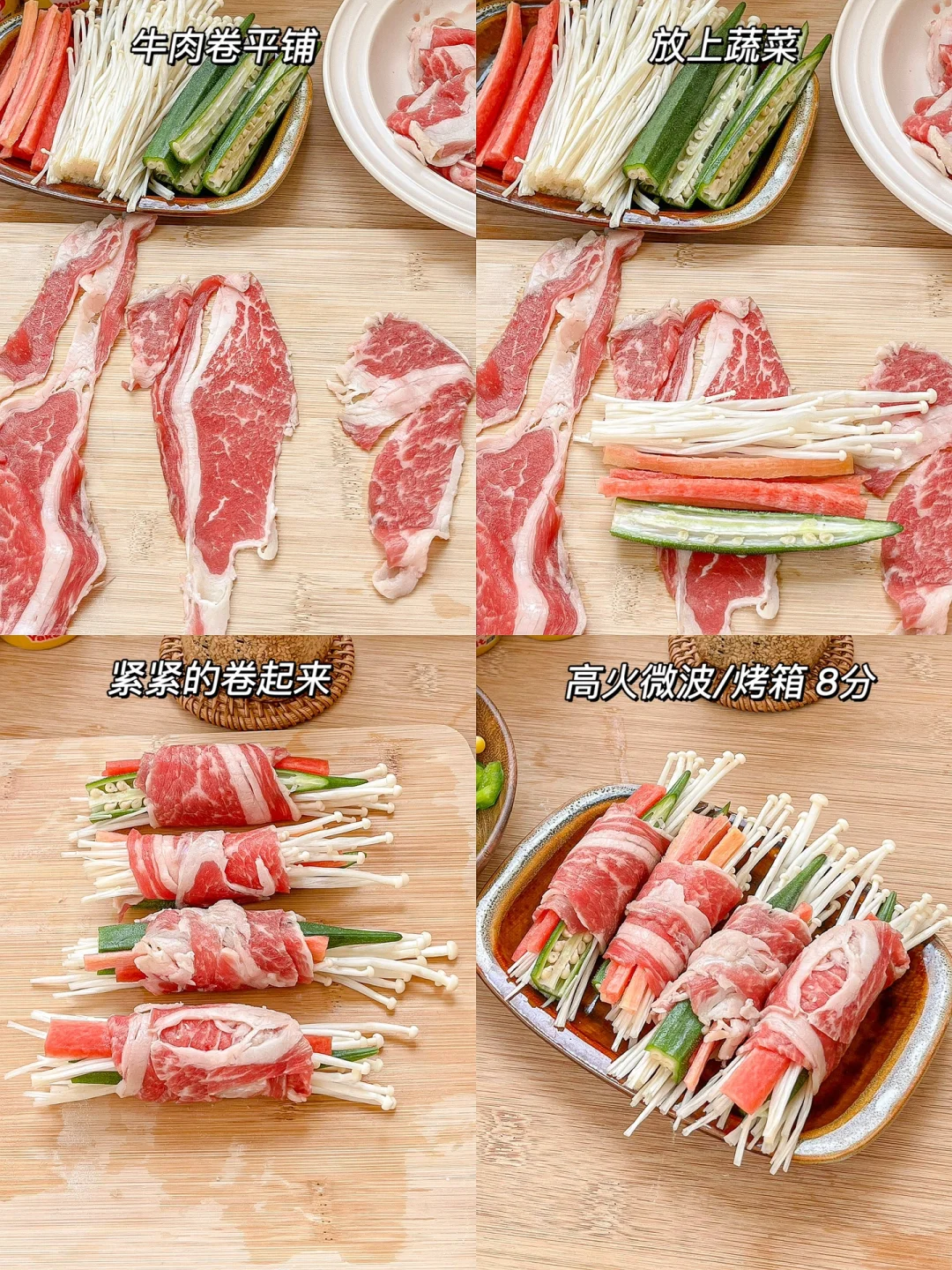 再做一个金针菇肥牛卷的升级版,杂蔬牛肉卷~我放了金针菇、胡萝卜、秋葵,还可以放豆芽、豆苗、韭菜,用牛肉卷卷紧,微波炉烧烤模式7分钟,或者蒸、烤箱都行。磨了一点新鲜姜泥,撒点盐和黑胡椒就可以。真是不加一点油的高蛋白低卡减脂菜!