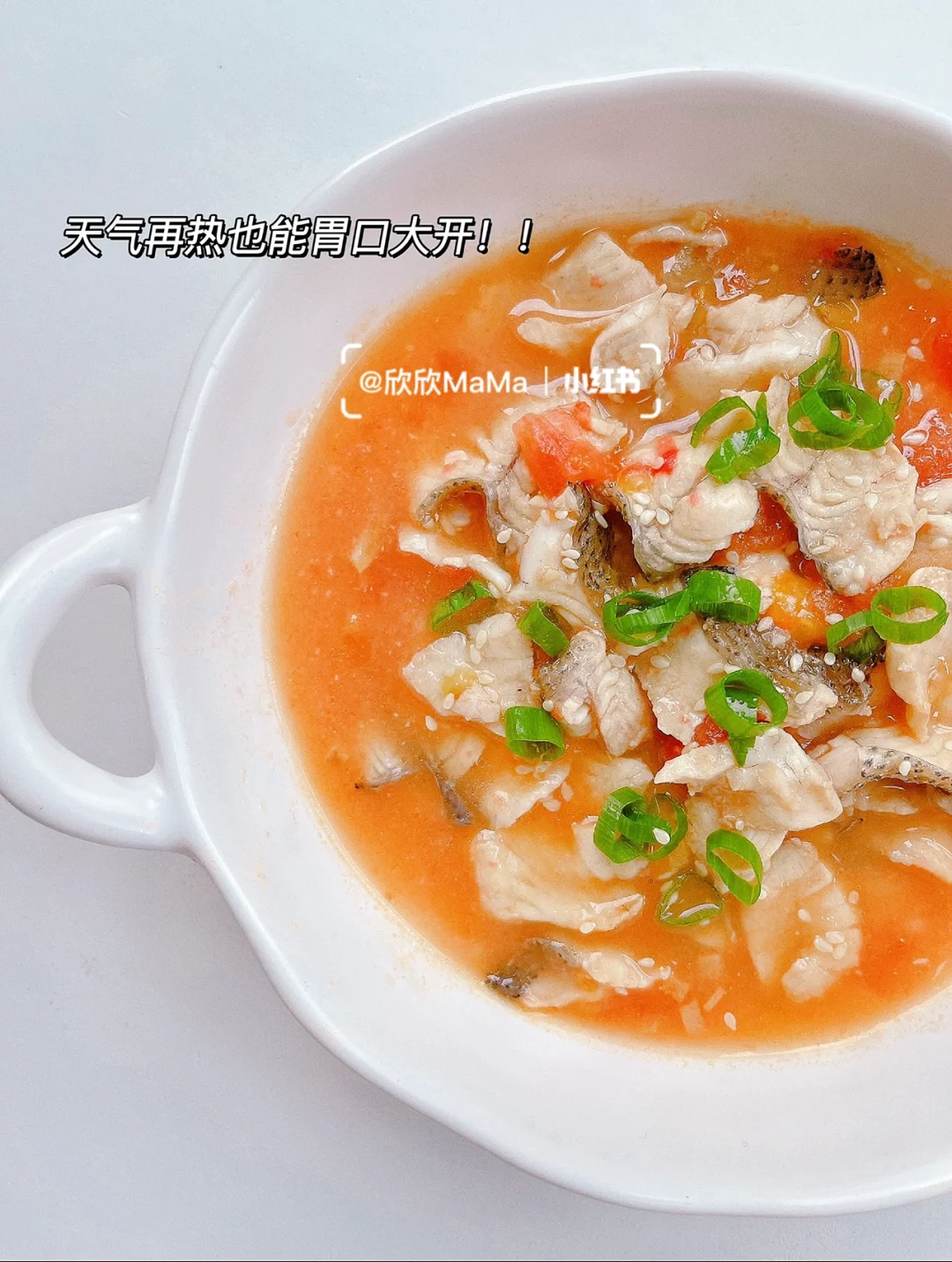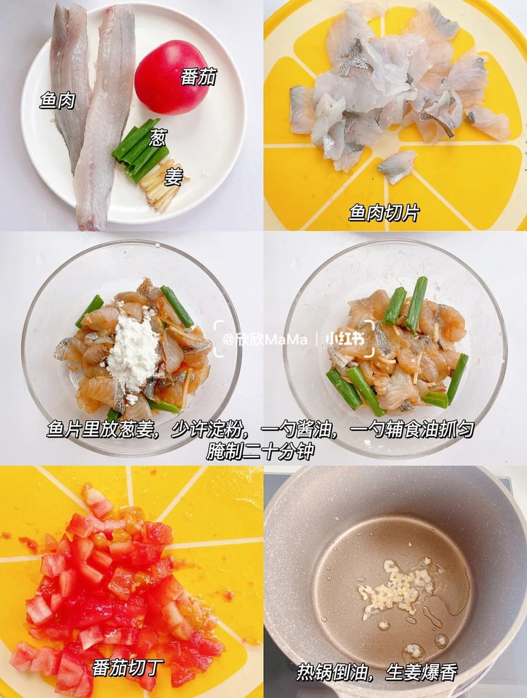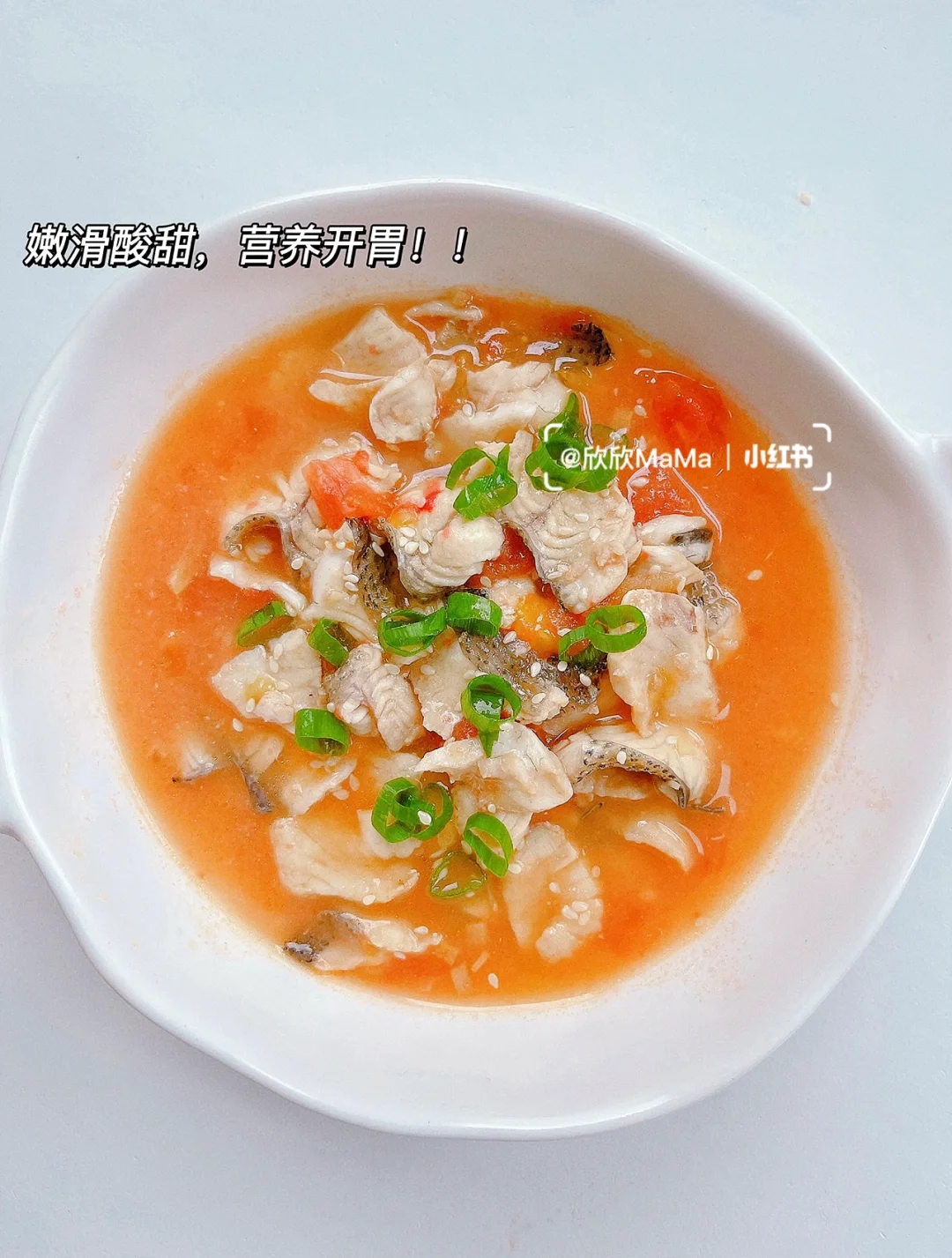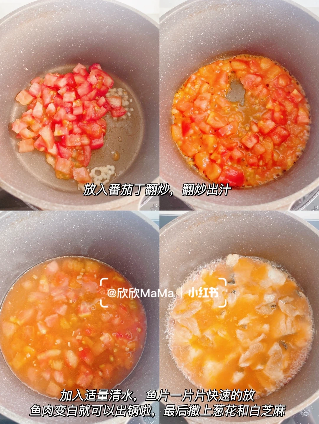 今天来分享一款大人小孩都爱吃的番茄鱼片汤! 做法简单,酸甜开胃,鲜嫩爽口的鱼肉,天气再热能开胃口大开,太下饭啦!妈妈们都要给我宝宝安排起来呀! 〰️〰️ 🛒准备食材: ✔️鲈鱼 ✔️番茄 ✔️葱 ✔️姜 〰️〰️ 👩‍🍳做法: 1️⃣鲈鱼去头去尾,切片的时候注意拔掉鱼刺 2️⃣鱼片里放入姜葱、少许淀粉,一勺酱油和一勺辅食油抓匀腌制二十分钟 3️⃣番茄去皮切丁,热锅倒油,生姜爆香,放入番茄丁翻炒出汁 4️⃣加入适量清水,鱼片一片片快速的放,鱼肉变白就可以出锅啦,最后撒入葱花和白芝麻即可 是不是很简单,赶快安排起来哦! 有问题也可以评论区留言哦! 💡关注我带您解锁更多辅食制作