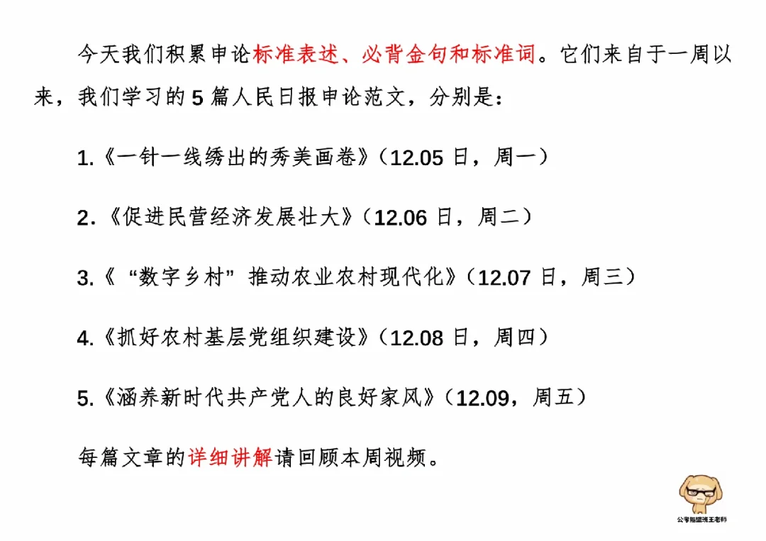 今天我们积累申论素材、必背金句和重点知识。它们来自于一周以来,我们学习的5篇人民日报申论范文,分别是: