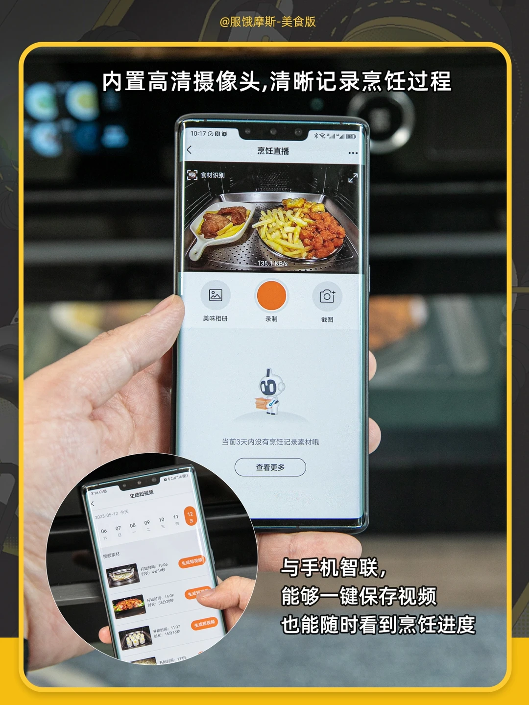 选择有内置摄像头的,能够连接手机,直接记录下整个烹饪过程,一键保存到手机。真的会爱这个功能。