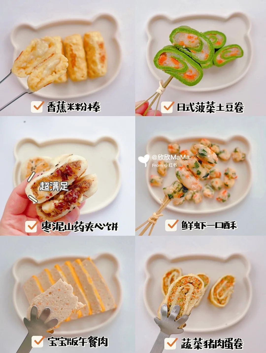 今天分享6款宝宝版手指食物,有夹心饼、蛋卷、一口酥、午餐肉、这样的大小很适合宝宝锻炼宝宝的抓握能力和咀嚼能力,重点是好吃呀!妈妈们安排起来哦 〰️〰️ 🌈不重样手指食物合集: ✅香蕉米粉棒 ✅枣泥山药夹心饼 ✅鲜虾一口酥 ✅宝宝版午餐肉 ✅蔬菜猪肉蛋卷 ✅日式菠菜土豆卷 具体做法请看👀图3-图9 ⚠️食材的大小根据宝宝自家咀嚼能力来调整 ⚠️一岁以上可加少许番茄酱和盐来调味! 妈妈们安排起来哦!