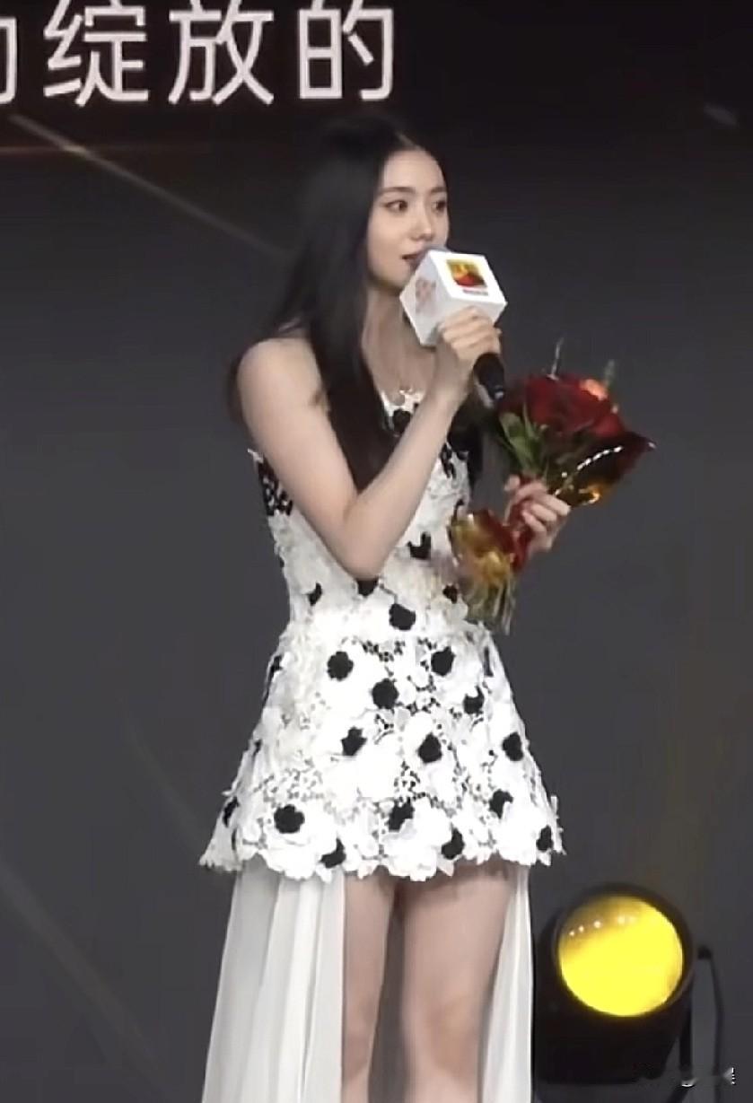 刘浩存身着黑白波点的短款蕾丝裙搭配飘逸白纱裙摆,手持鲜花与话筒,她肤白貌美