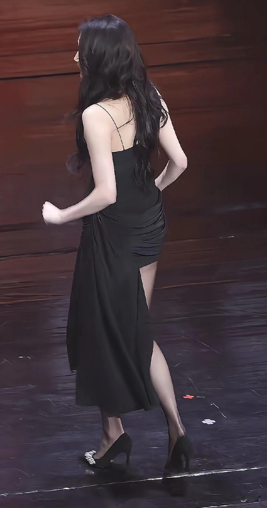 在颁奖现场的关晓彤,一袭黑色不规则礼服,侧边的蝴蝶结俏皮精致,裙摆的独特设计搭配黑丝与高跟鞋,手中的奖杯闪耀,长发微卷