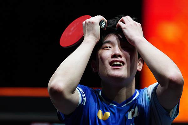 12月7日混合团体世界杯上,林诗栋2比1战胜日本队选手张本智和。新华社