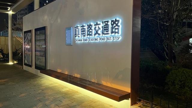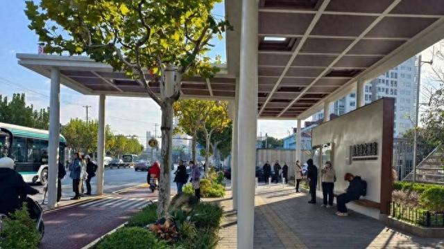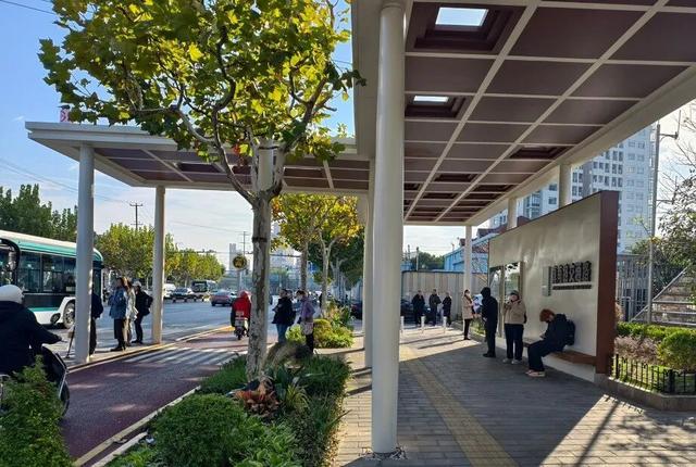区别于传统枢纽的“大而全”,微枢纽主要以“小而美”的设计理念,打造集便民服务、智慧导览、城市美学于一体的“社区客厅”。真南路交通路站点采用风雨连廊和公交站台一体化设计,连廊总长45米,净空高度4.5米。等候区景墙则与电子公交信息屏有机融合,实时同步公交动态,集成风雨遮蔽、休闲停留、公交换乘等核心功能。