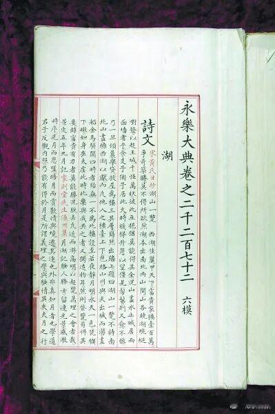 眼前这册《永乐大典》与程有庆在国图地库中看到的《永乐大典》一模一样。袁女士这册《永乐大典》是“模”字韵的“湖”字,内容是与“湖”字有关的部分。此前,国图已经收藏了两册“湖”字单册,在程有庆印象中,中间正好缺这一册。不过为了保险起见,他立刻打电话给曾在中华书局工作的父亲,请他帮忙查一下已发现《永乐大典》的存目。